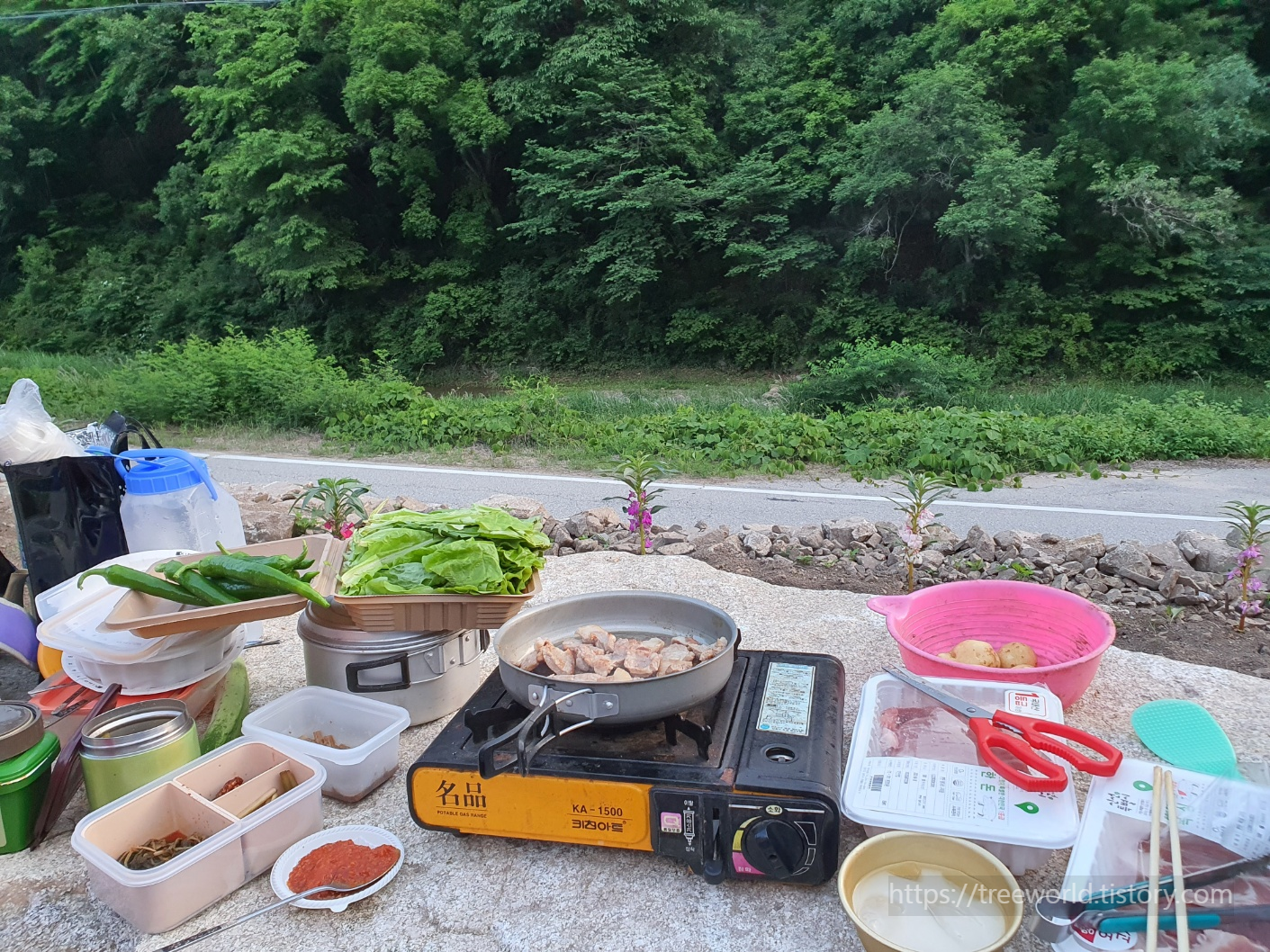 개울이 보이는 바위위에서 삼겹살에 막걸리 한잔하면서 오늘의 고생을 보람으로 만족을 찾는 시간입니다.