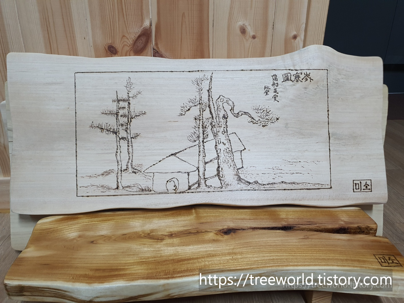 세한도는 추사 김정희(1786~1856) 선생님이 제주도에 유해되어 있을 때 그린 그림입니다. 이것을 목판에 인두로 따라 그리기를 해 보았습니다.