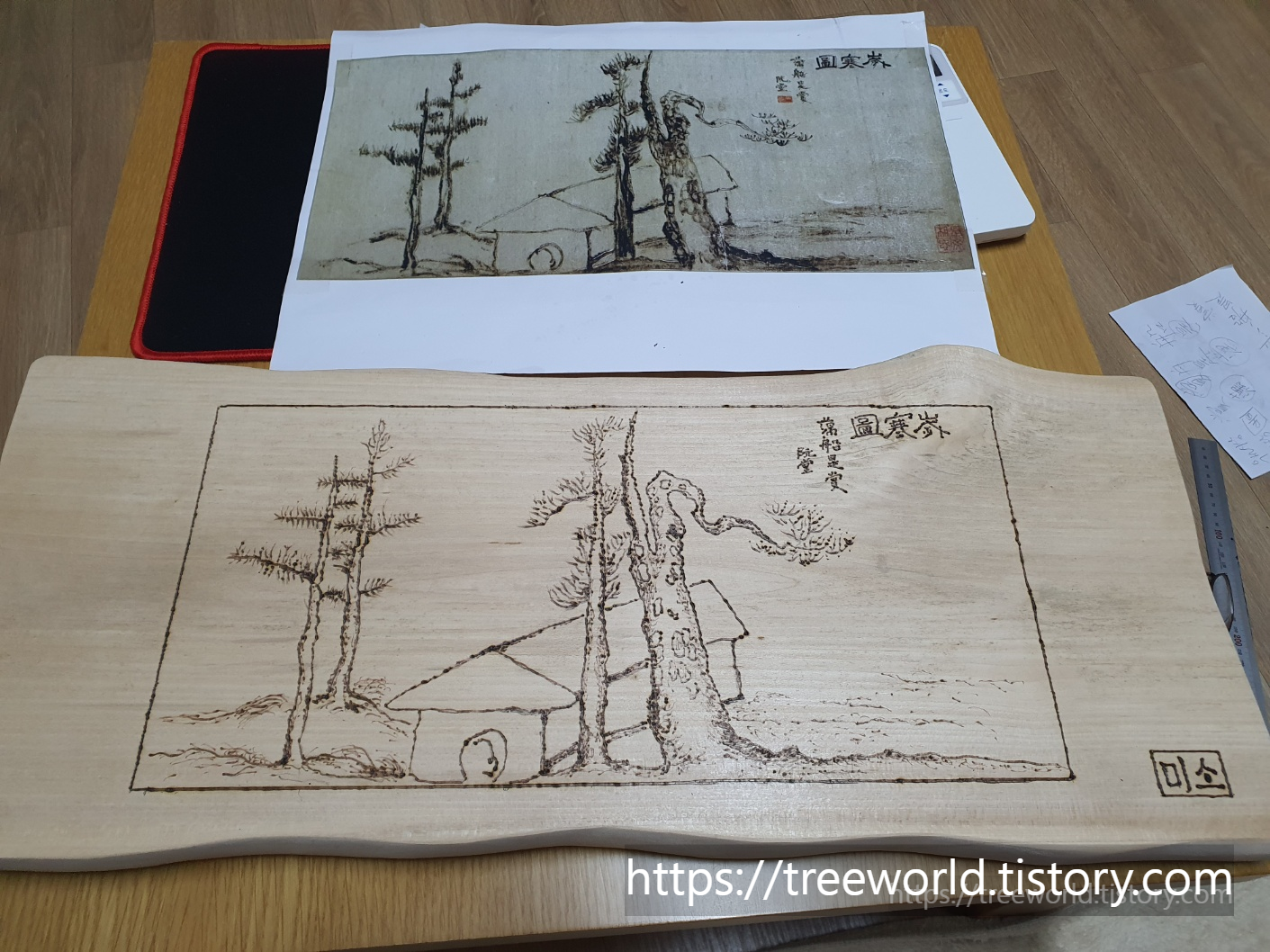 세한도는 추사 김정희(1786~1856) 선생님이 제주도에 유해되어 있을 때 그린 그림입니다. 이것을 목판에 인두로 따라 그리기를 해 보았습니다.