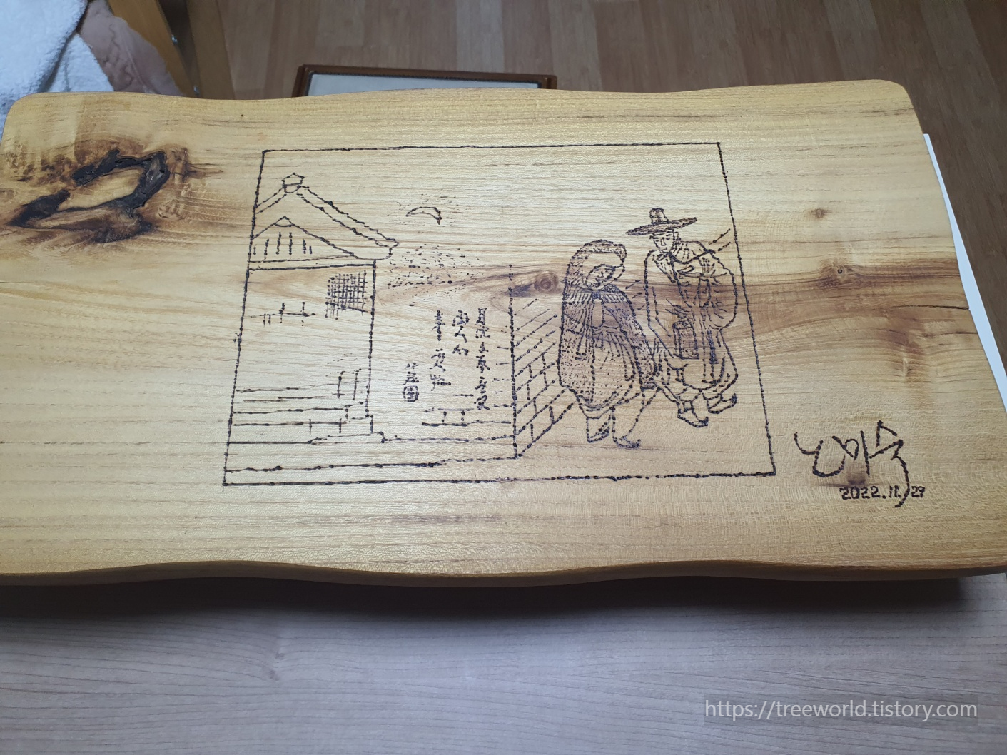 40년 이상된 아까시나무에 목공용 인두로 작업을 했습니다.
