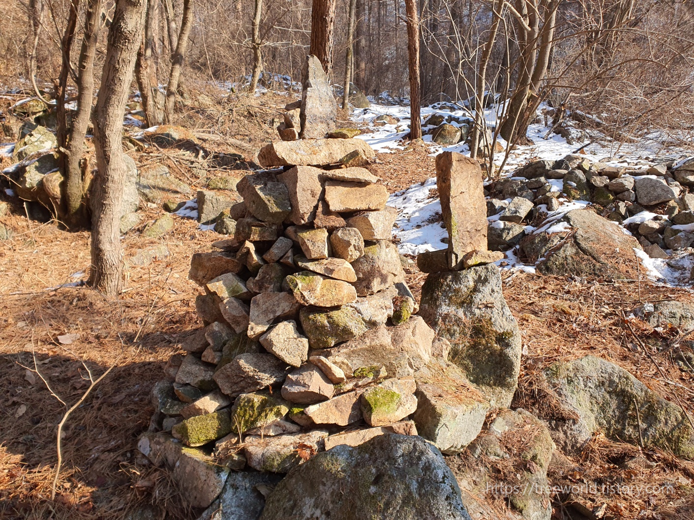 낮고 평평한 산이고 예전에 화전민들이 밭을 일굴다 모아놓았던 돌이 많이 있습니다.