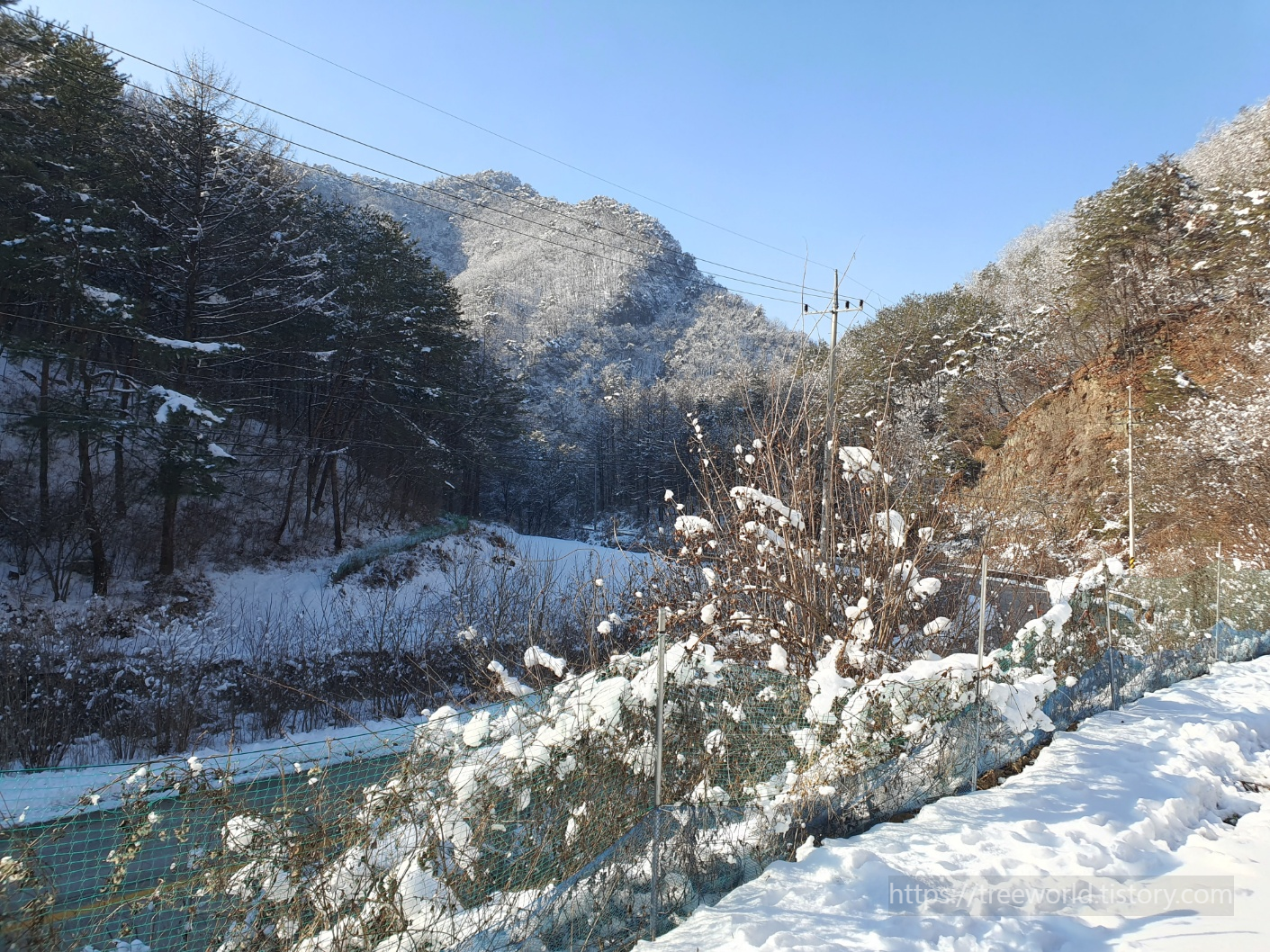뒷산에 올라가서 눈 내린 집앞산을 보았습니다.