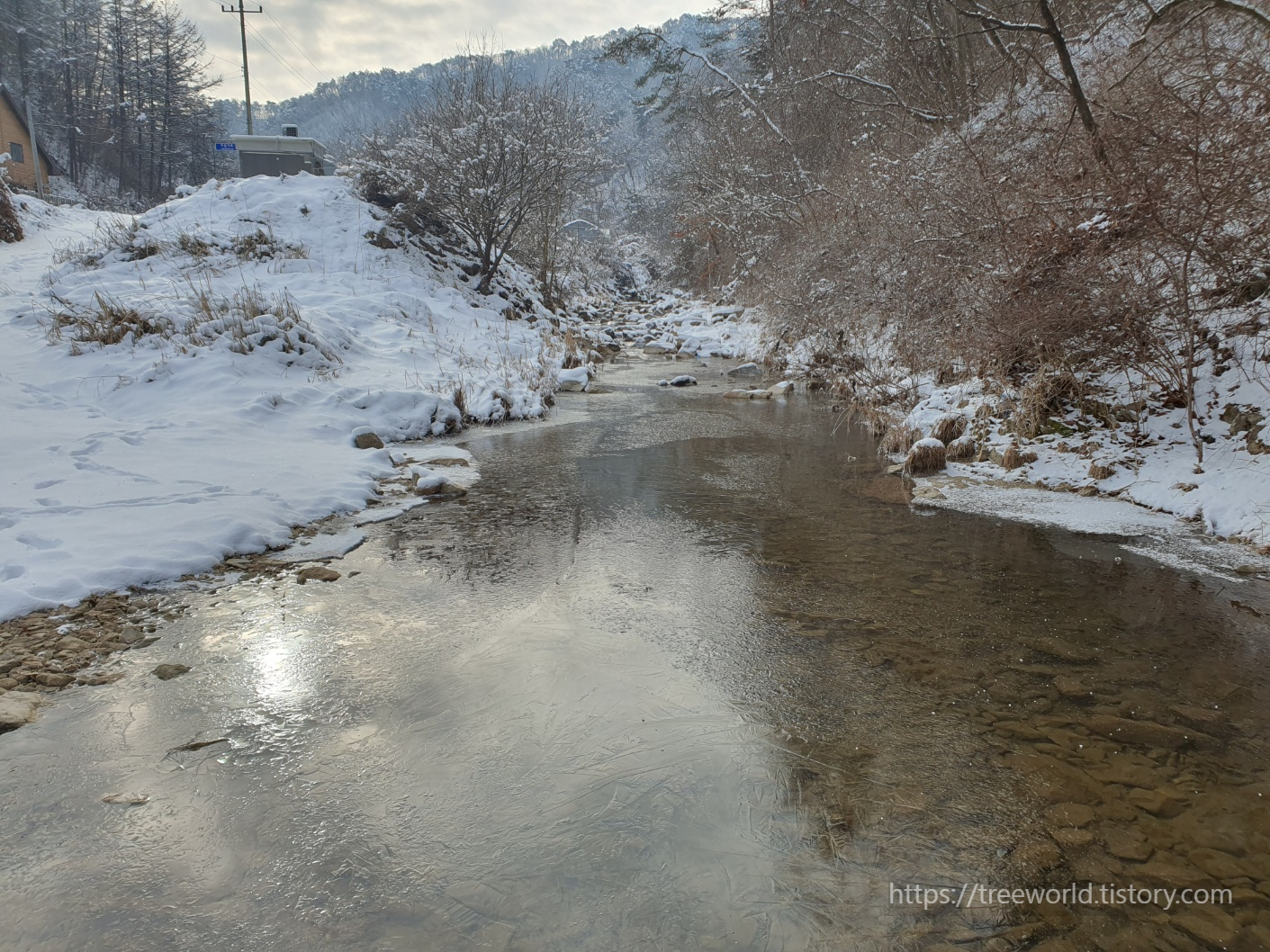 집 앞 개울가에 물이 작년겨울에 비해 반으로 줄었습니다. 작년 여름에는 개울에 물이 가득해서 좋았는데