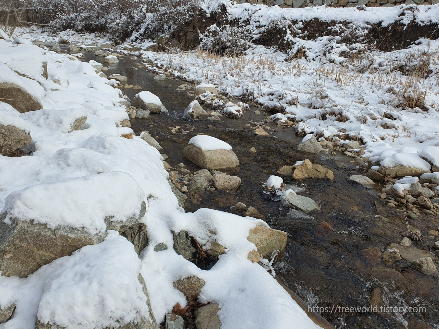 갈대가 무성하던 개울가 주변이 겨울이 되니 황량합니다. 지금이 멋은 더 있어 보입니다. 물이 조금 작은 게 아쉬움이지만