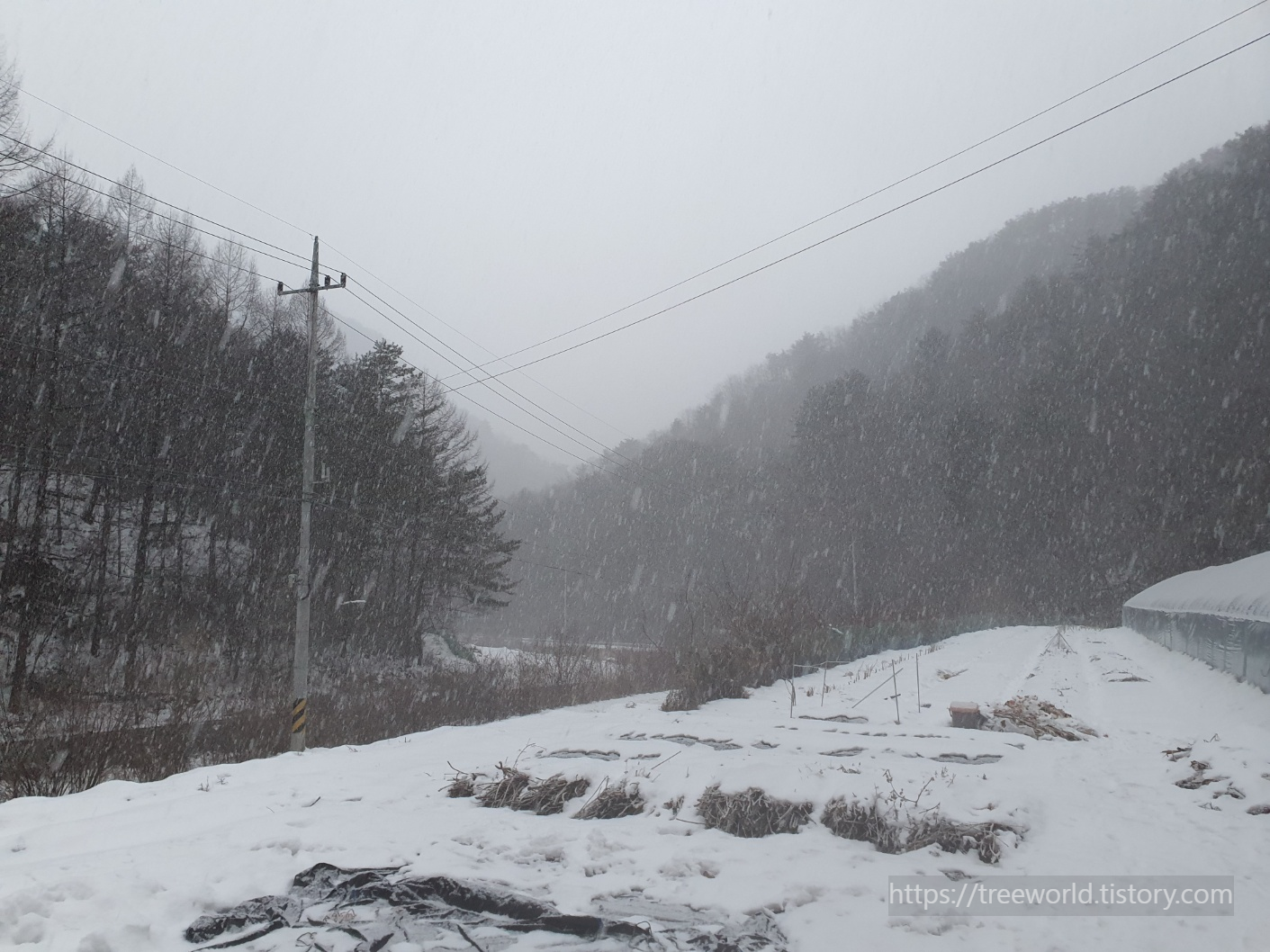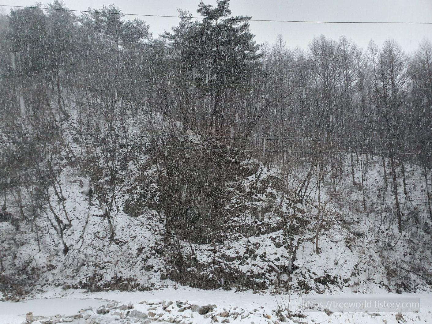 하늘 끝에서 땅끝으로 끊임없이 내려오는 눈을 보면서 마음은 시원해지지만