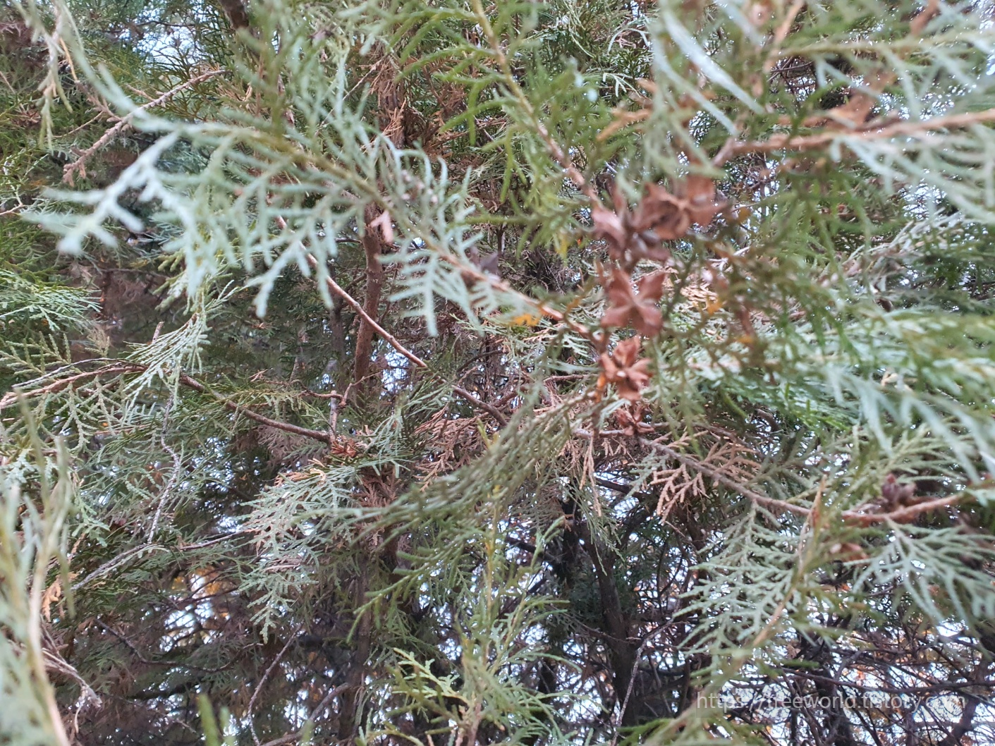 수목감별 특징은 잎과 열매입니다. 잎은 납작한 비늘처럼 나란히 포개지는 잎을 가지고 있습니다.