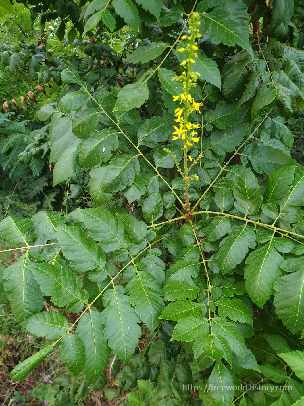 익으면서 황색으로 변합니다. 열매가 익으면 3갈래로 갈라집니다. 잎은 어까시나무 잎처럼 피며 어긋납니다. 모야은 달걀모양 입니다.