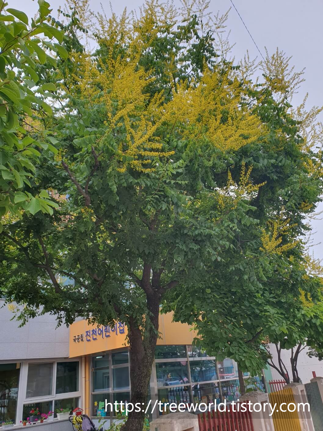 모감주나무의 꽃은 7월에 노란색으로 원추형으로 가지에 달립니다. 열매는 꽈리처럼 생겼는데 처음에는 녹색이었다가