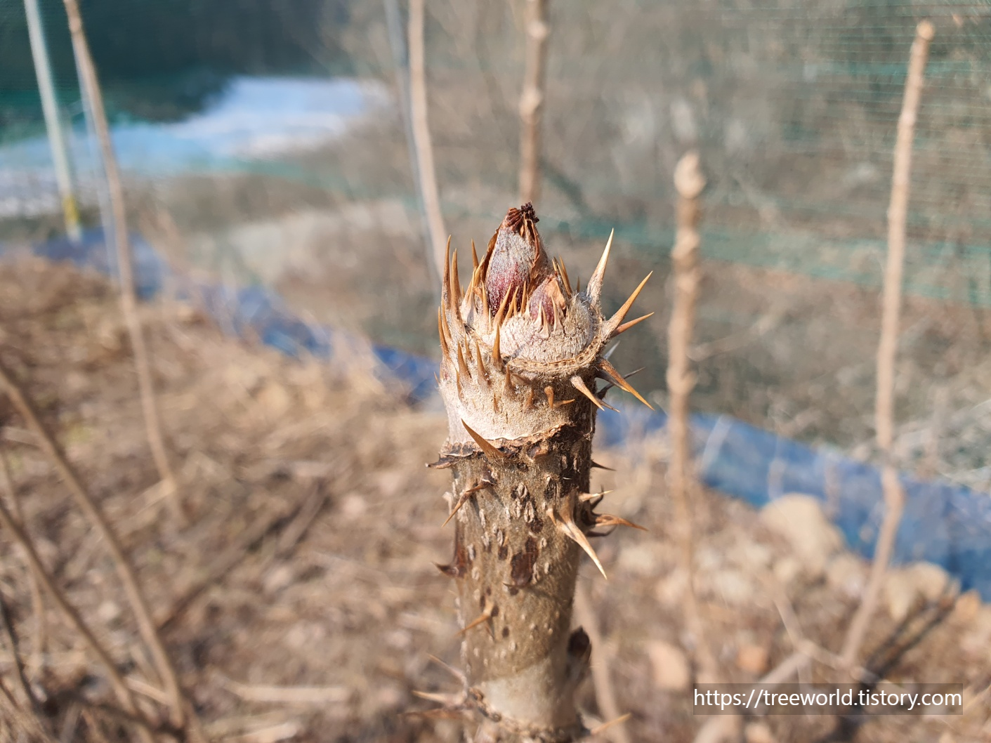 수목감별포인트는 수피에 있는 가시와 큰 잎입니다.