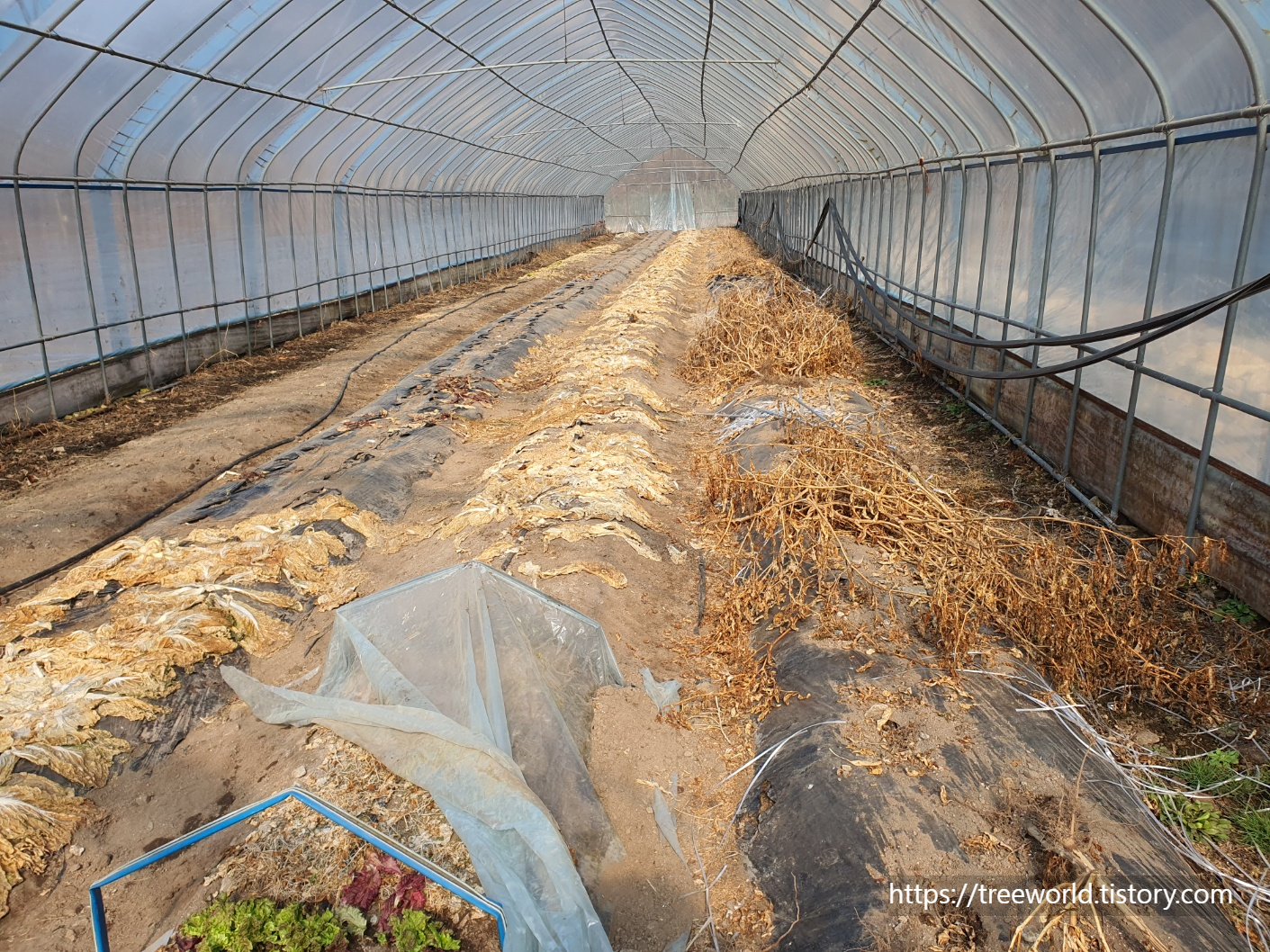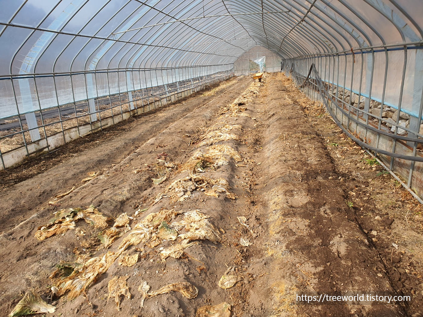 작년에 지었던 배추, 고추, 기타 여러 가지 채소 농사짓던 비닐과 흔적들을 지우고