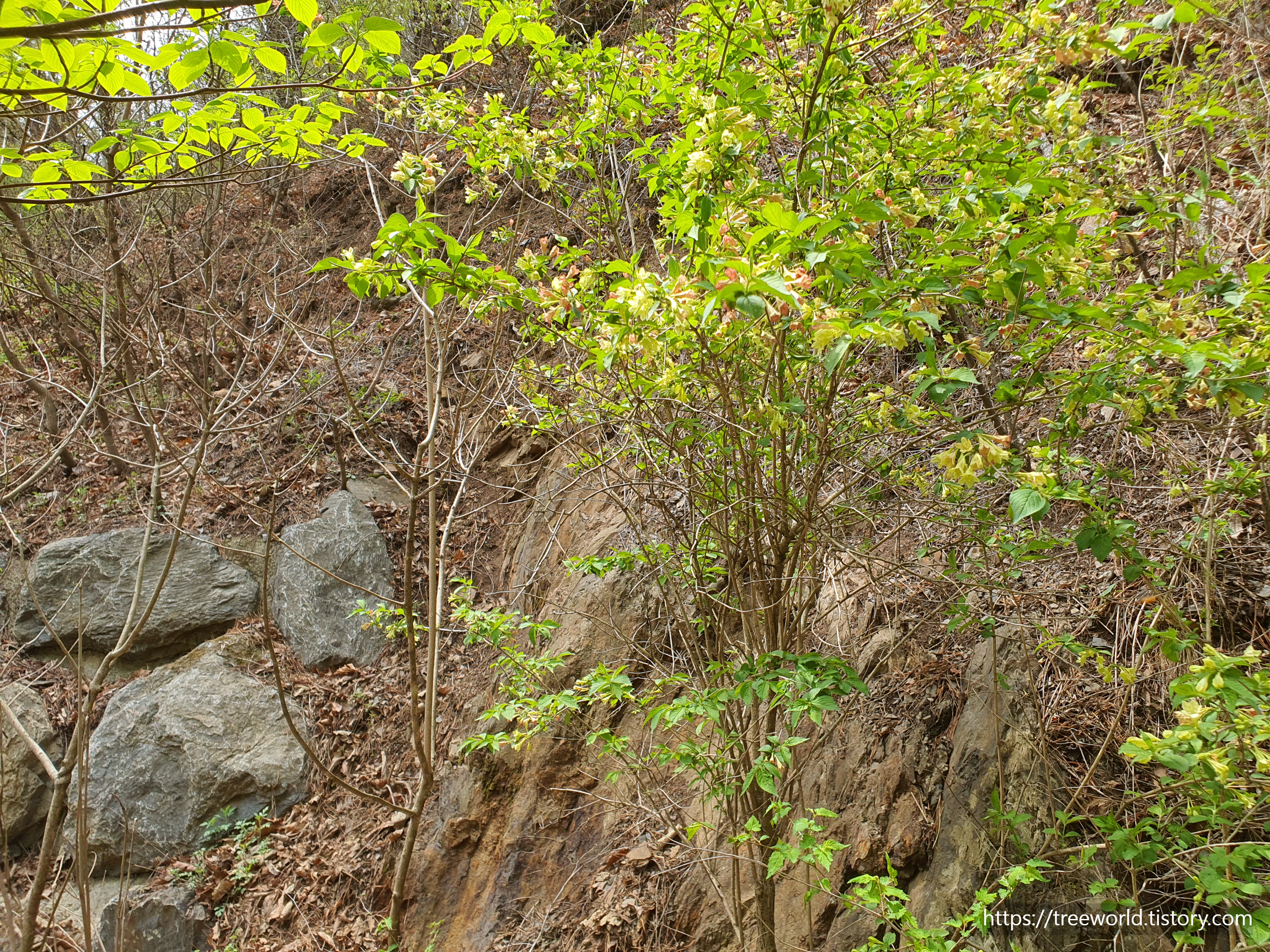 높이 2~3m 정도이며 5월에 병모양의 꽃이 노랗게