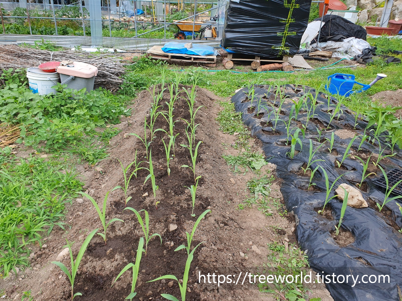 옥수수 모종은 멀칭비닐 속에 심었습니다.