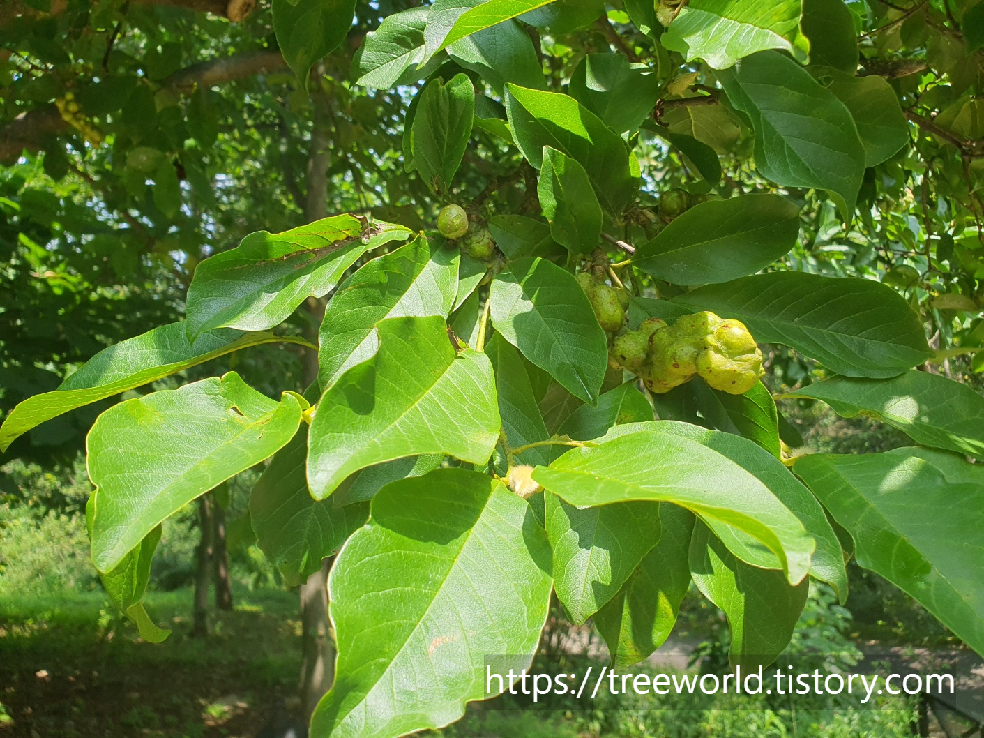목력의 잎은 끝이 꼬리처럼 뾰족하고 두껍습니다.