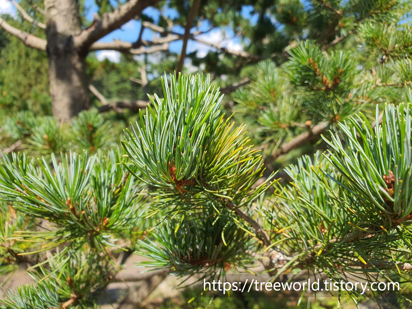 섬잣나무 잎은 5엽송이며 짧습니다.