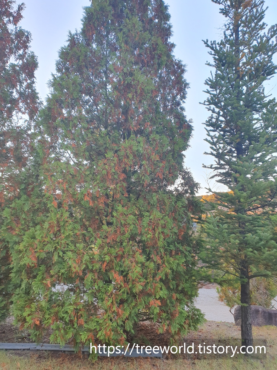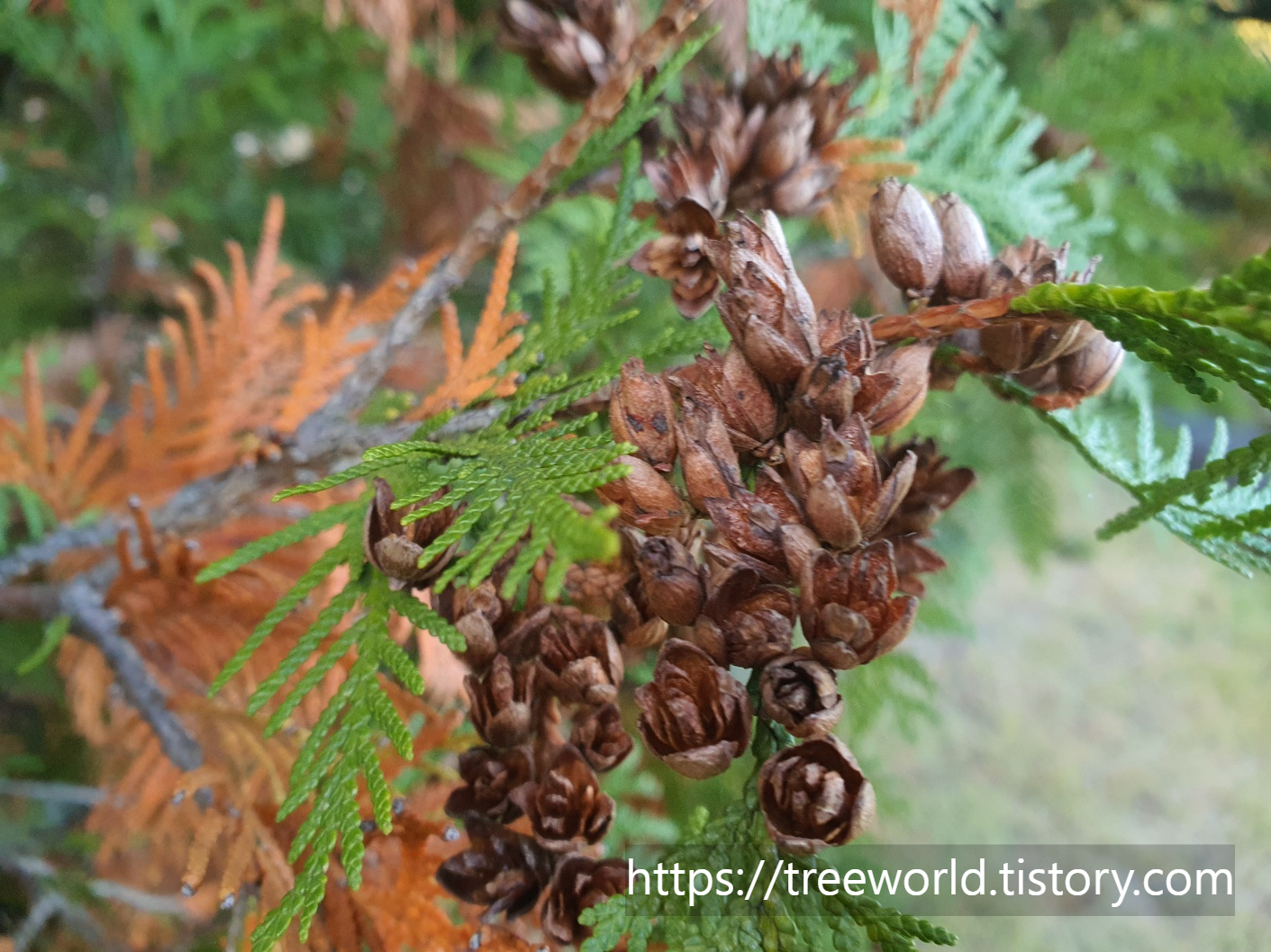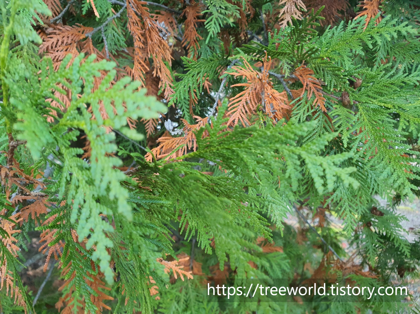 잎은 납작 하게 자라는 일반적인 측백나무와