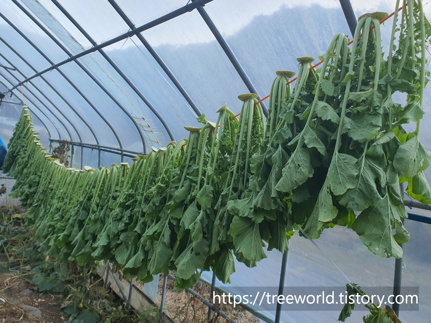 깨끗하게 정리한 청들은 이제 비나 눈을 맞지 않는 장소에 끈을 매어 청 말리기를 하면 됩니다. 그늘에서 말리면 좋지만 겨울햇살에 잘 마르지 않기 때문에 눈비를 피할 수 있는 하우스 안에 설치하여 건조시켰습니다. 햇볕을 보면 비타민D가 많이 함양되기 때문에 더욱 효과적입니다.
