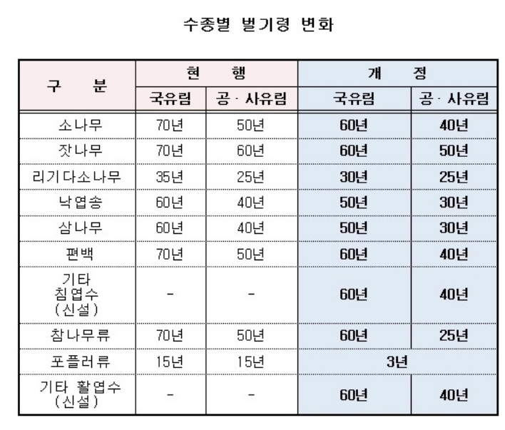 소나무와 잣나무의 벌기령은 국유림 70년에서 60년으로 공사유림은 50,60년에서 40,50년으로 개정되었습니다.