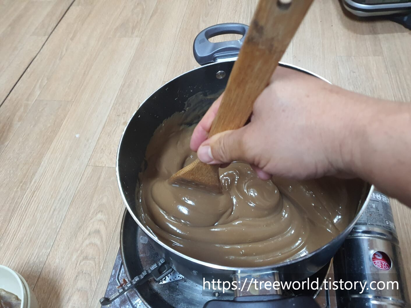 맛있는 도도리묵을 만들기 위해서는 반건조 앙금을 미지근한 물에 1:4의 비율로 넣고 완전하게 녹인다음 들기름 한 스푼과 소금 미량을 넣고 연한불에 끓이기 시작합니다. 완전히 마른 앙금가루는 1:6의 비율로 물을 넣습니다.