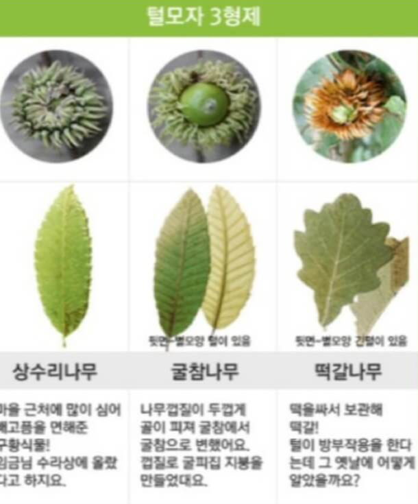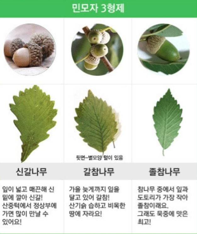 참나무 6형제 중 털모자는 상수리, 굴참, 떡갈나무 3종류입니다. 상수리와 굴참은 도토리가 매우 크고 둥급니다. 떡갈은 좀작고 길쭉한 편입니다. 잎은 상수리와 굴참은 비슷하지만 뒷면의 색이 다르고 떡갈은 잎이 제일 큰 종류입니다. 떡을 싸서 보관할 정도라 합니다.