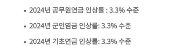 2024년 공무원, 군인, 국민연금등 모든 연금의 매년 인상률은 전년도 전국 소비자물가 상승률에 따라 정해 집니다.
