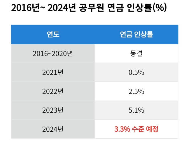 공무원의 과거 연금 인상률입니다. 공무원 연금은 2001년에 기금이 고갈되어 2016년~20년까지 고갈되었다가 21년부터 인상되었습니다. 그러나 군인등 일부는 동기간에도 인상 되었 습니다. 감사합니다.