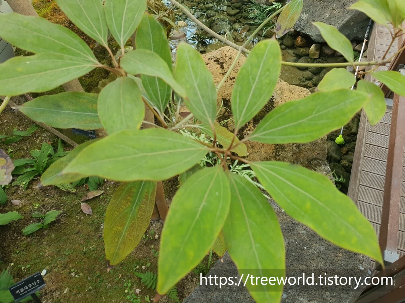 나무의사의 수목감별 법 중 참식나무의 새잎은 4월경에 아래로 처지며 황갈색 털이 밀생하지만 곧 없어지고 3개의 맥이 뚜렷합니다. 표면은 녹색이고 뒷면은 흰빛입니다.