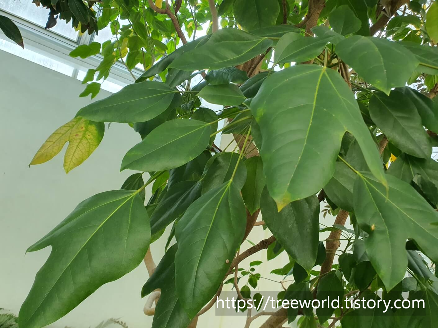 나무의사의 수목감별법 중 남부수종 황칠나무의 잎은 어긋나게 나며 달걀 모양의 타원형입니다. 어린잎은 3~5개로 갈라지며 톱니가 있지만 큰 가지의 잎은 밋밋합니다. 잎은 윤기가 나며 짙은 녹색입니다. 열매는 9~11월 정도에 검은색으로 열립니다. 황색칠을 사용할 때 사용되는 나무의 진액은 8월 정도에 채취합니다.