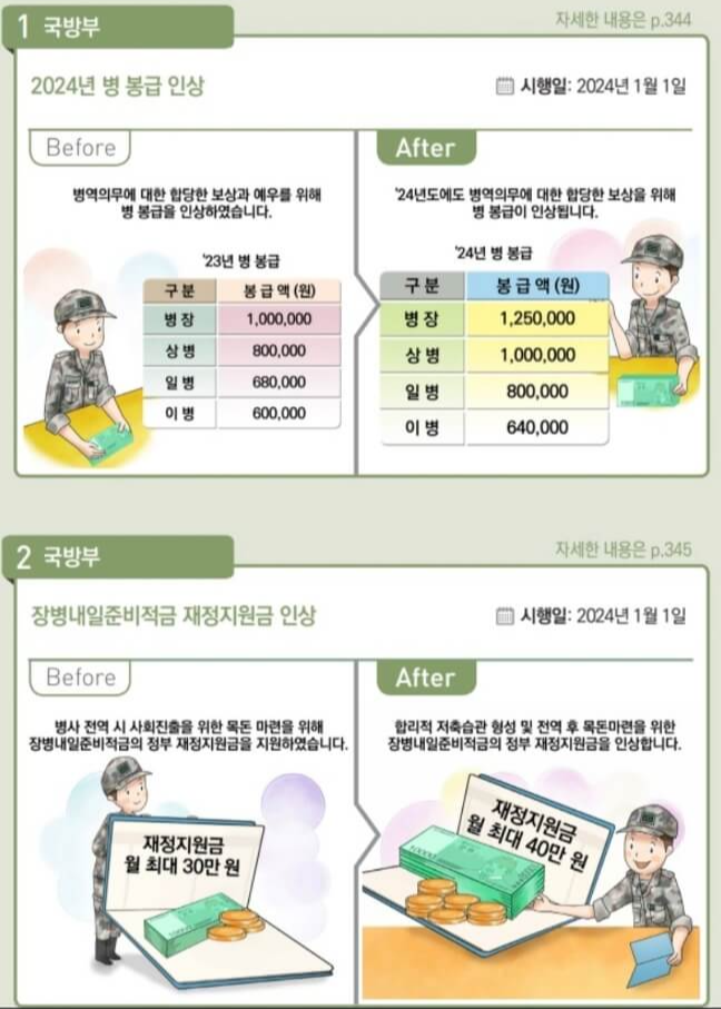 2024년 병 봉급인상에 맞춰 단기 장교 부사관의 장려금도 장교는 2023년 900백만원에서 1,200백만 원으로, 단기복무 부사관은 750만 원에서 1,000만 원으로 인상됩니다. 그 외 초급간부 복무여건 개선을 위한 주택수당 신설, 훈련 시 간부 영내급식비 지원, 당직근무비 인상 등 초급간부들의 처우개선도 대폭 시행 됩니다.