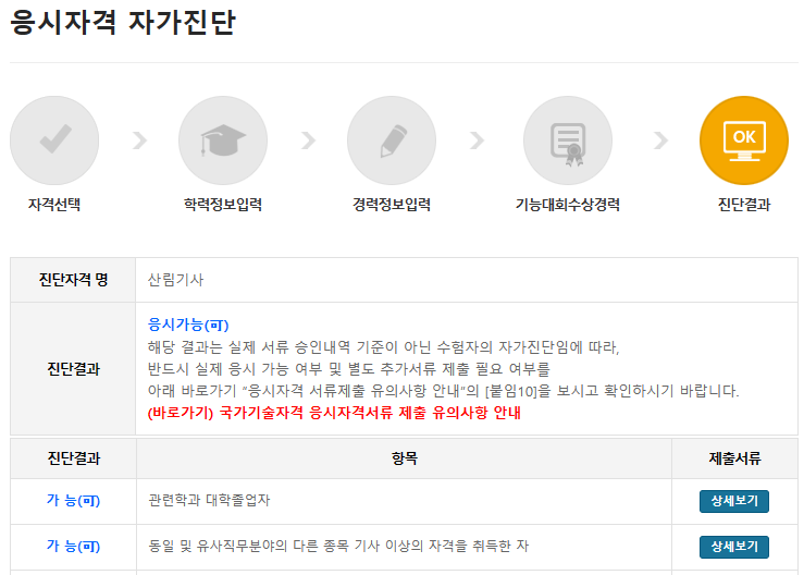응시자격 자가진단은 수험자가 임의로 한것이므로 서류입력 후 반드시 최종결과를 확인해야 합니다.