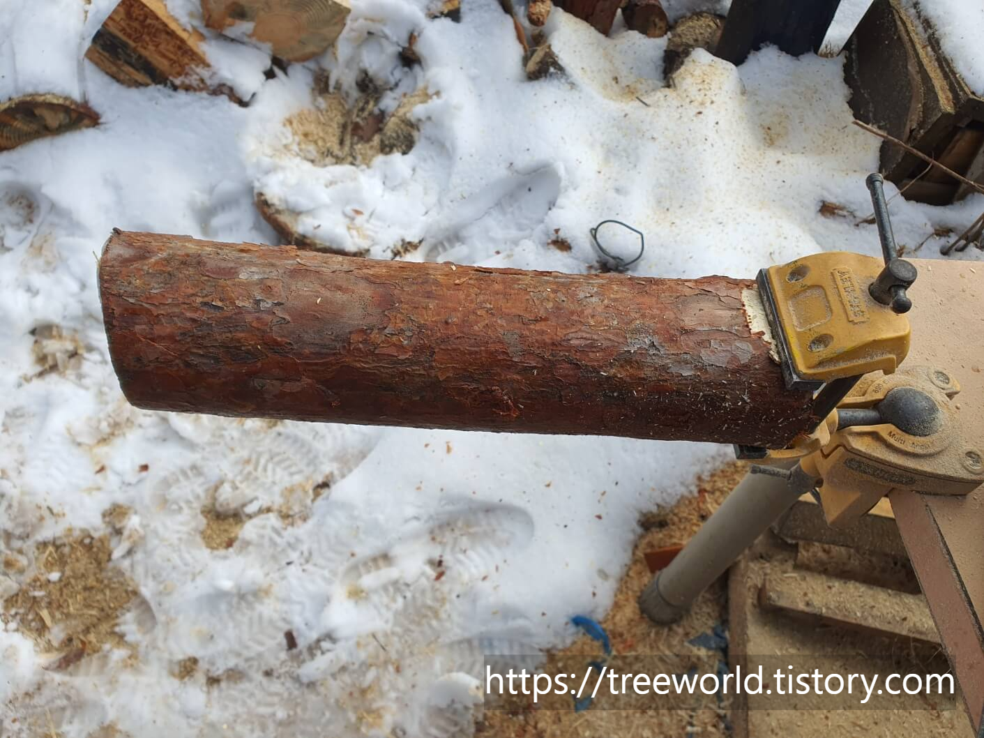 소나무 원목을 어느정도 건조해 길이 40cm, 직경 8cm로 자른 다음 엔진톱으로 기본 형태를 만들고 그라인더로 연마하여 몸통을 만듭니다. 그런 다음 목을 연결할 부분에 드릴로 구멍을 뚫으면 몸통이 완성됩니다.