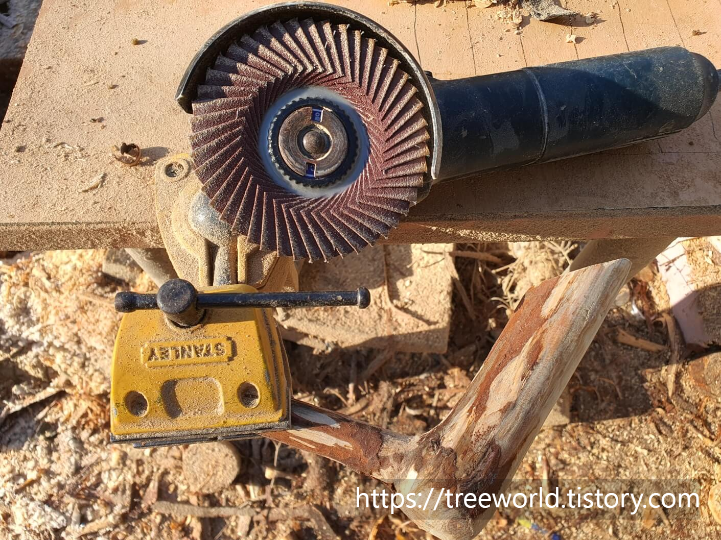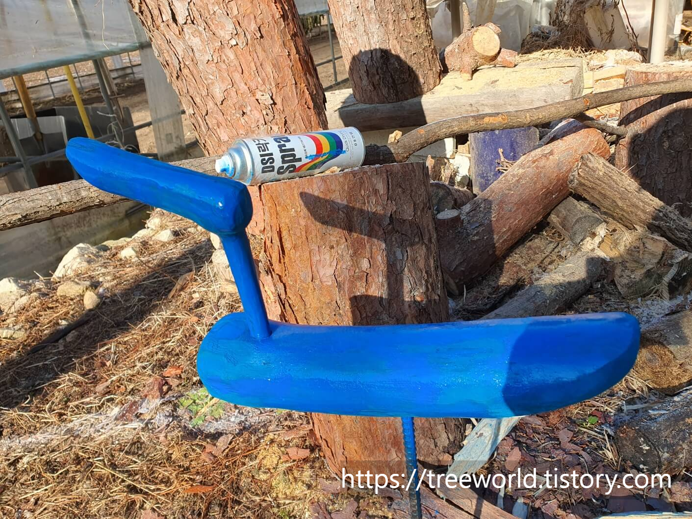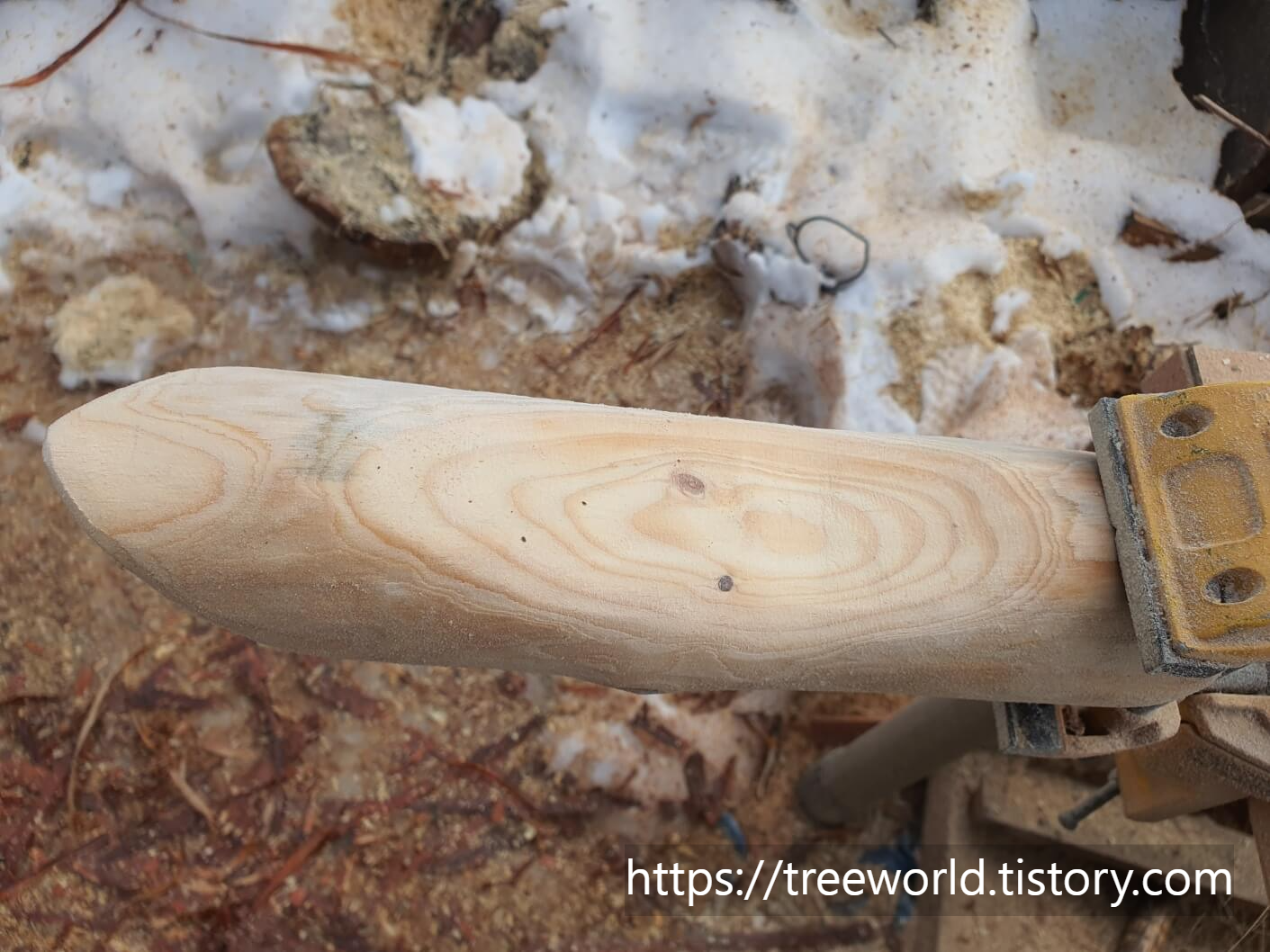 소나무 원목을 어느정도 건조해 길이 40cm, 직경 8cm로 자른 다음 엔진톱으로 기본 형태를 만들고 그라인더로 연마하여 몸통을 만듭니다. 그런 다음 목을 연결할 부분에 드릴로 구멍을 뚫으면 몸통이 완성됩니다.