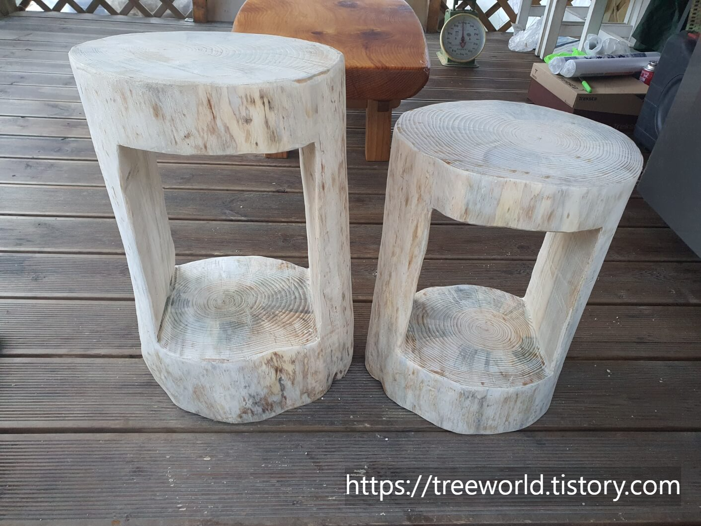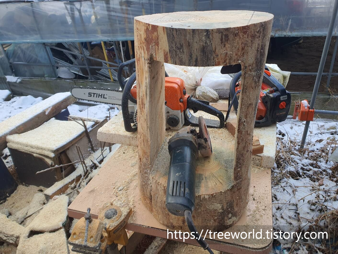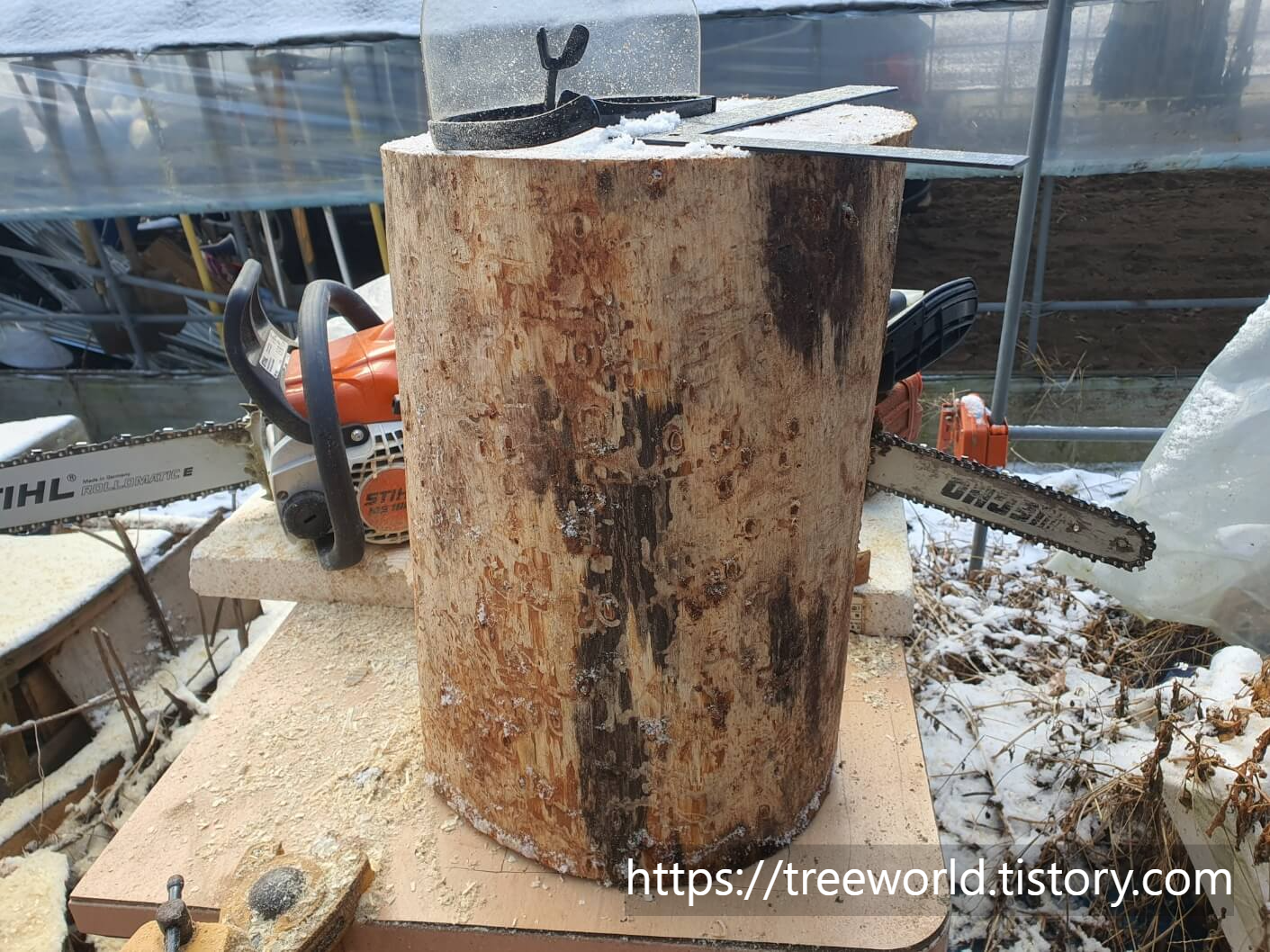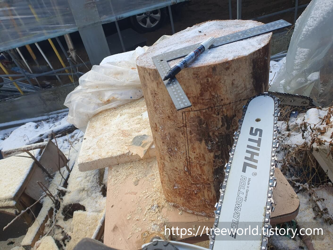 화분받침대용 원목이 결정되면 우선 나무의 껍질을 벗기고 기본 설계를 하여야 합니다. 기본 설계를 하지 않고 작업을 하면 구상한 대로 만들기가 어렵습니다. 원목 자르기는 엔진톱을 이용하면 공정이 간단해집니다. 엔진톱은 산림용 스틸 18인치와 조경용 에코엔진톱 10인치가 있으면 아주 효과적으로 작업을 할 수 있습니다. 목공예품을 만들 때는 항상 원목에 기본설계를 하고 작업을 해야 목재낭비가 없습니다.