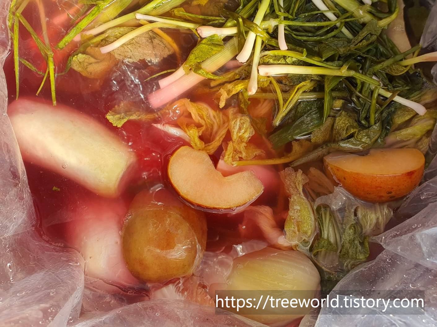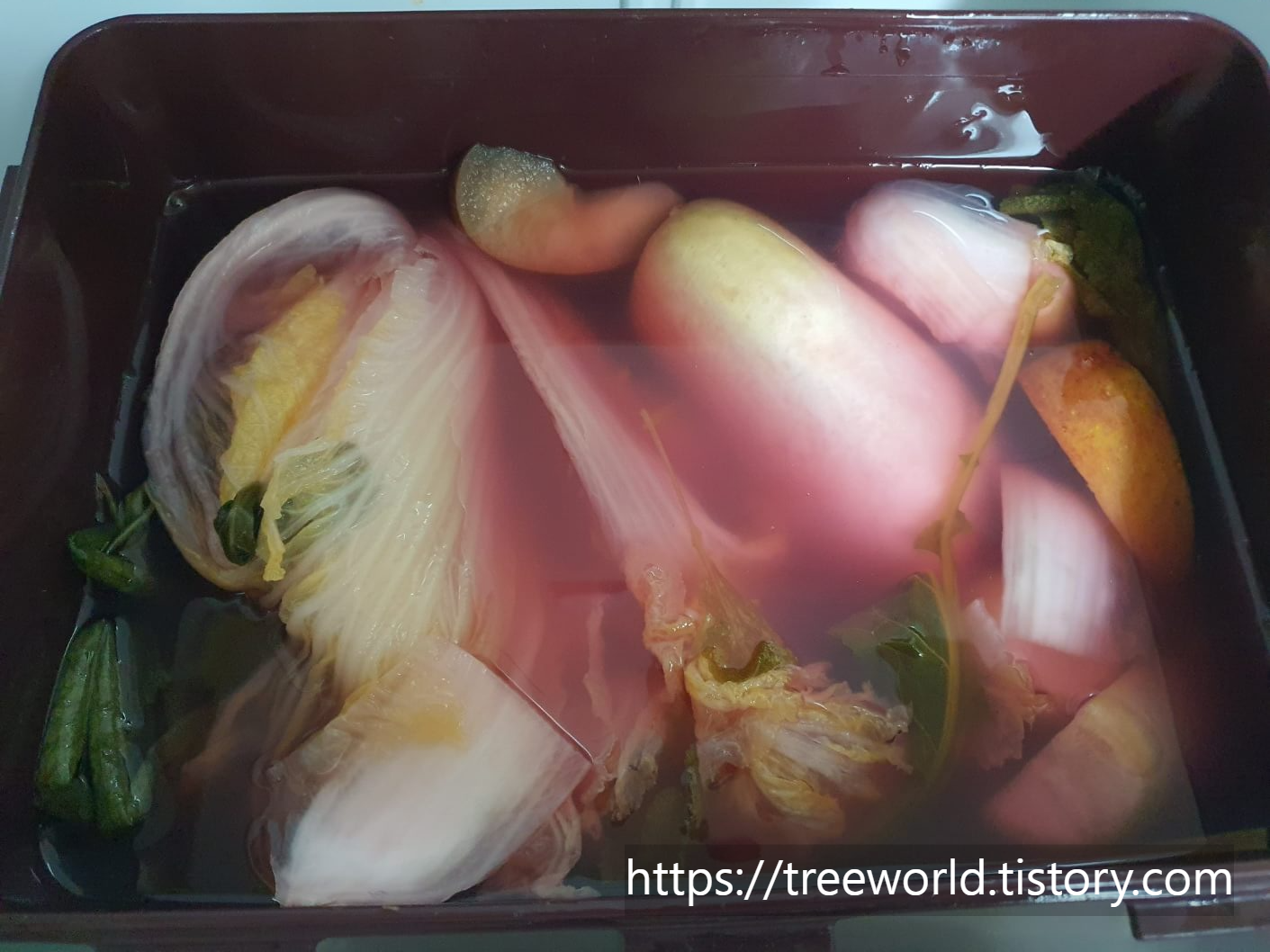 주재료로 자색무를 사용하였습니다. 그리고 살짝 절인 배추와 갓, 파, 사과, 배, 고추씨, 그리고 자색무를 넣고 농도가 낮은 소금물을 부었습니다. 큰 80L통(4말)에 담았기 때문에 하나하나의 양을 가름하기가 어렵습니다. 설탕대신 뉴슈가가 좋다고 합니다. 맛있는 동치미 담그는 법에서 소금물의 농도는 매우 중요합니다. 겨우내 숙성을 하기 위해서는 너무 싱그우면 바로 상할 수 있어 유의해야 합니다.
