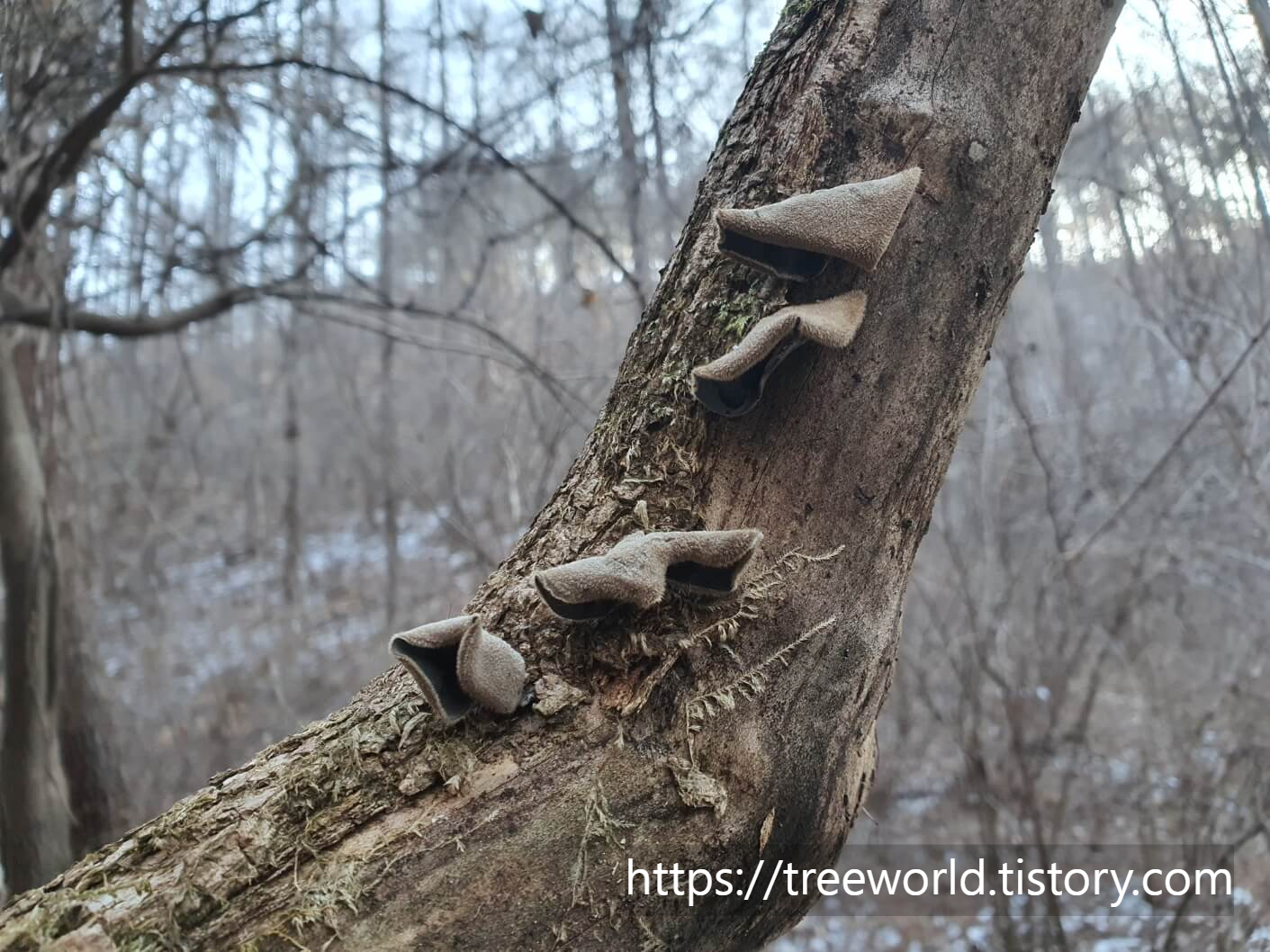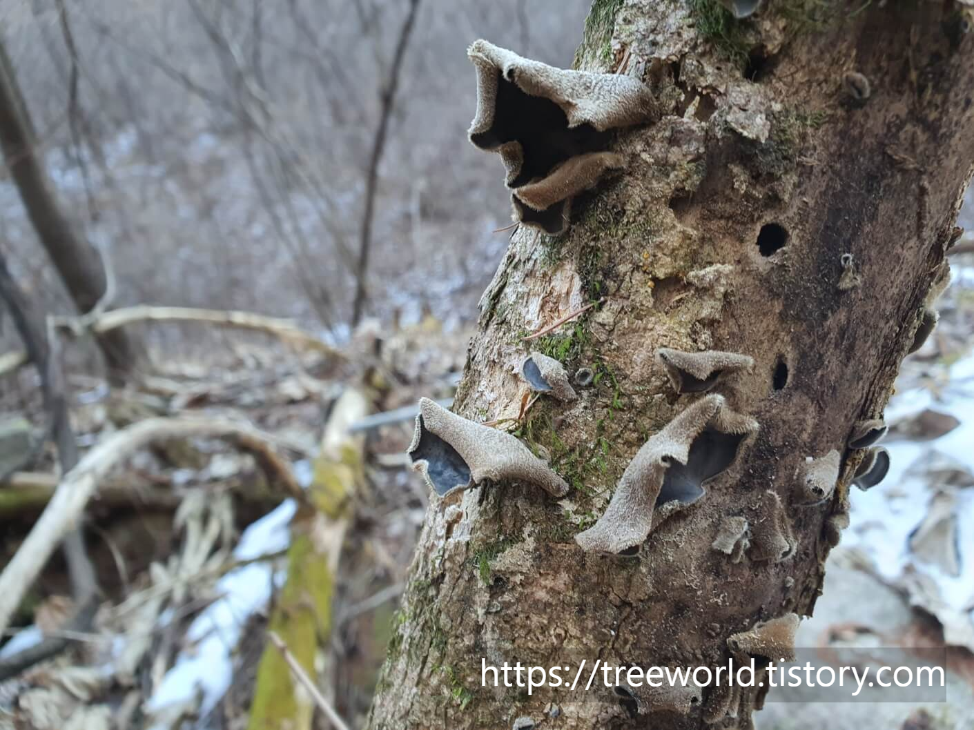 한겨울에 자연에서 채취할 수 있는 버섯은 목이버섯 밖에 없습니다. 자연산 목이버섯 채취는 특히 한겨울에 더욱 쉽습니다. 나뭇잎이 다 떨어지고 나면 나무에 붙어 있는 버섯이 더욱 잘 보입니다. 그리고 얼어서 잘 부서지지도 않아 관리도 편합니다. 또 벌레도 없어 아주 깨끗한 상태의 양질의 목이버섯을 채취할 수 있습니다.