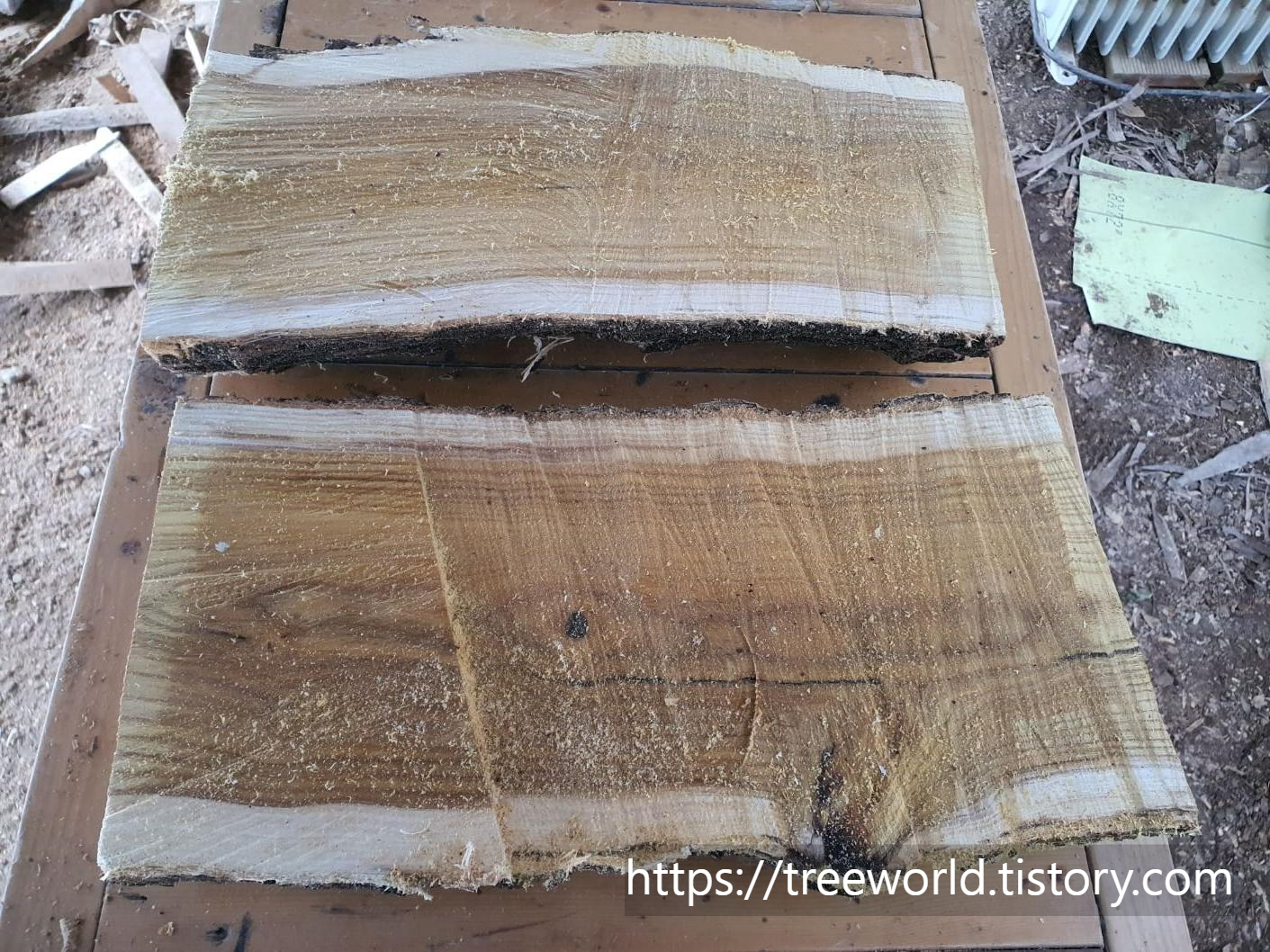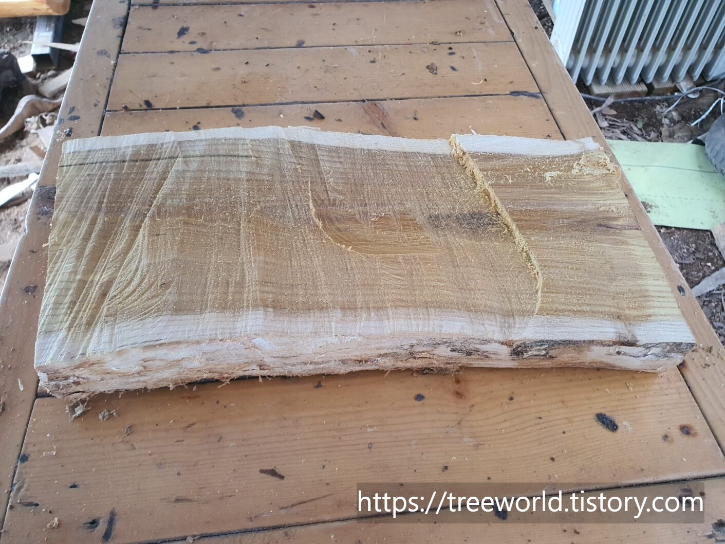 뽕나무 원목 도마 만들기의 첫 번째 과정은 선별된 원목을 말려서 켜야 하는데 제재소 갈 수 없으므로 엔진톱으로 반자르고 또 목재형태로 가공을 했습니다. 그리고 말려야 하는데 통상 1~2개월은 말려야 도마를 만들고 나서 뒤틀림이 없습니다. 켜서 말릴 때도 음지에서 말려야 하며 연륜을 보고 예쁜 쪽을 기준으로 말려야 합니다.