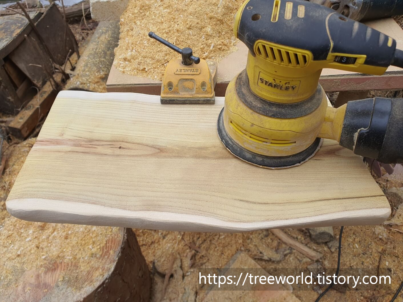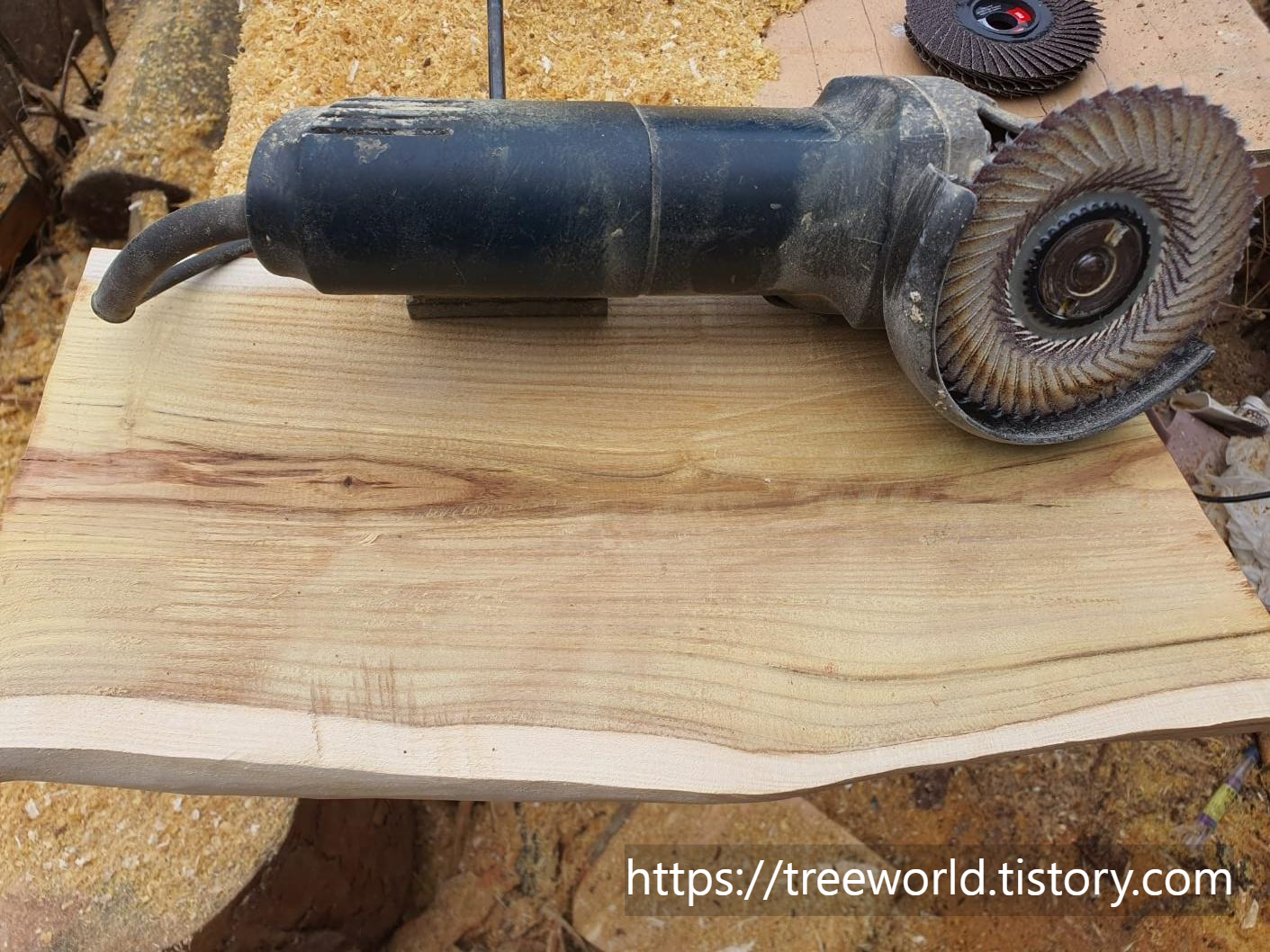 뽕나무 원목 도마 만들기 공정은 순서가 있습니다. 거칠게 만들어진 목재를 바이스로 고정시키고 전동대패질을 하여 평평하게 만들어야 하는데 이때 너무 많이 원목을 깎으면 얇아지기 때문에 평형하게 균형만 잡고 다음으로 거친 날의 그라인더로 모양 다듬기를 합니다. 거친 날은 쉽게 목재가 깎이기 때문에 조심해야 하고 사용 시 특히 안전에 유의해서 두 손으로 그라인더를 잡하야 합니다. 그런 다음 그라인더날을 고운 것으로 교체하여 어느 정도 윤곽 만들기 끝내야 합니다. 마지막은 고운 날(#200 이상)의 샌딩기로 연마작업을 하면 됩니다.