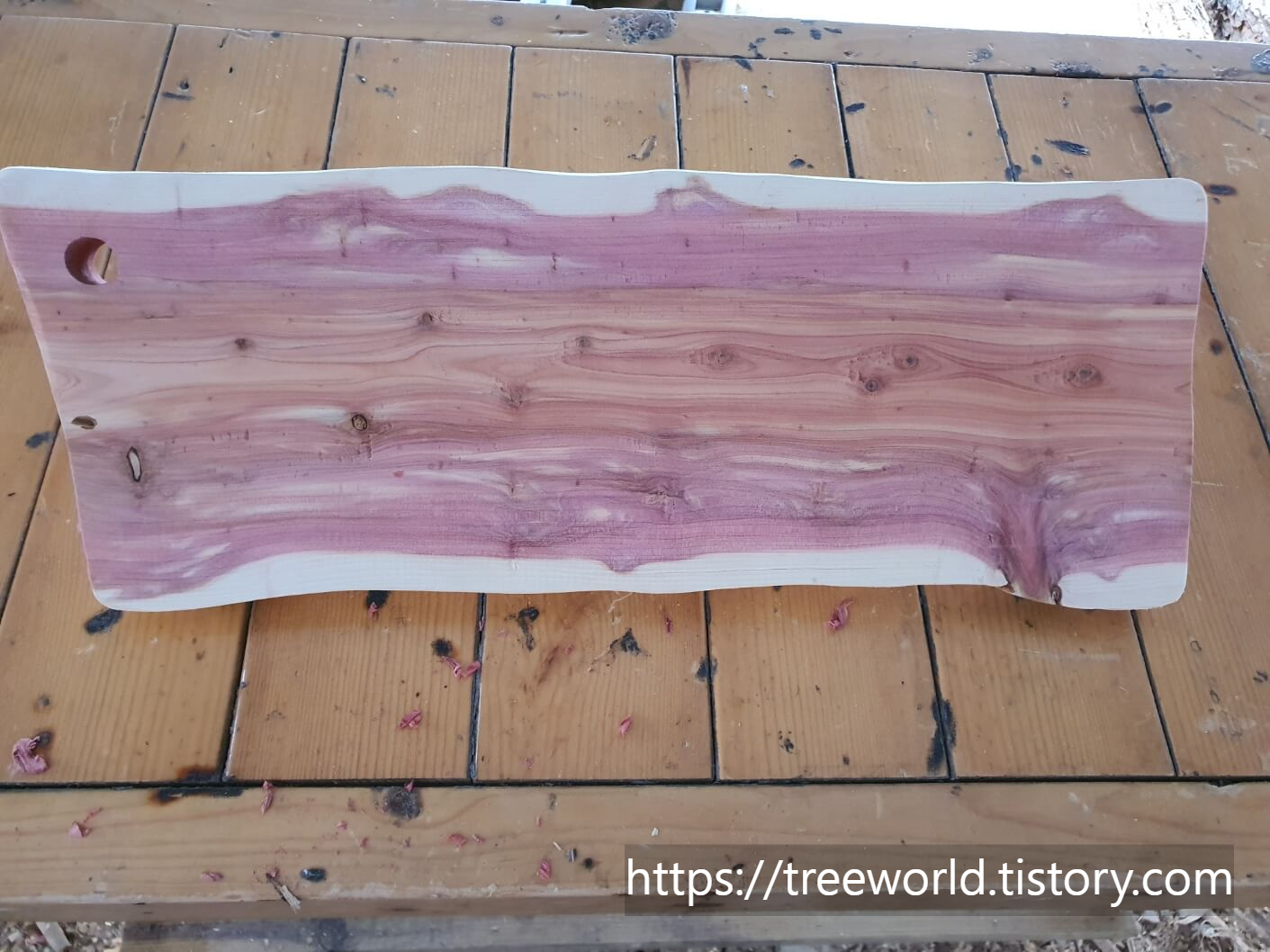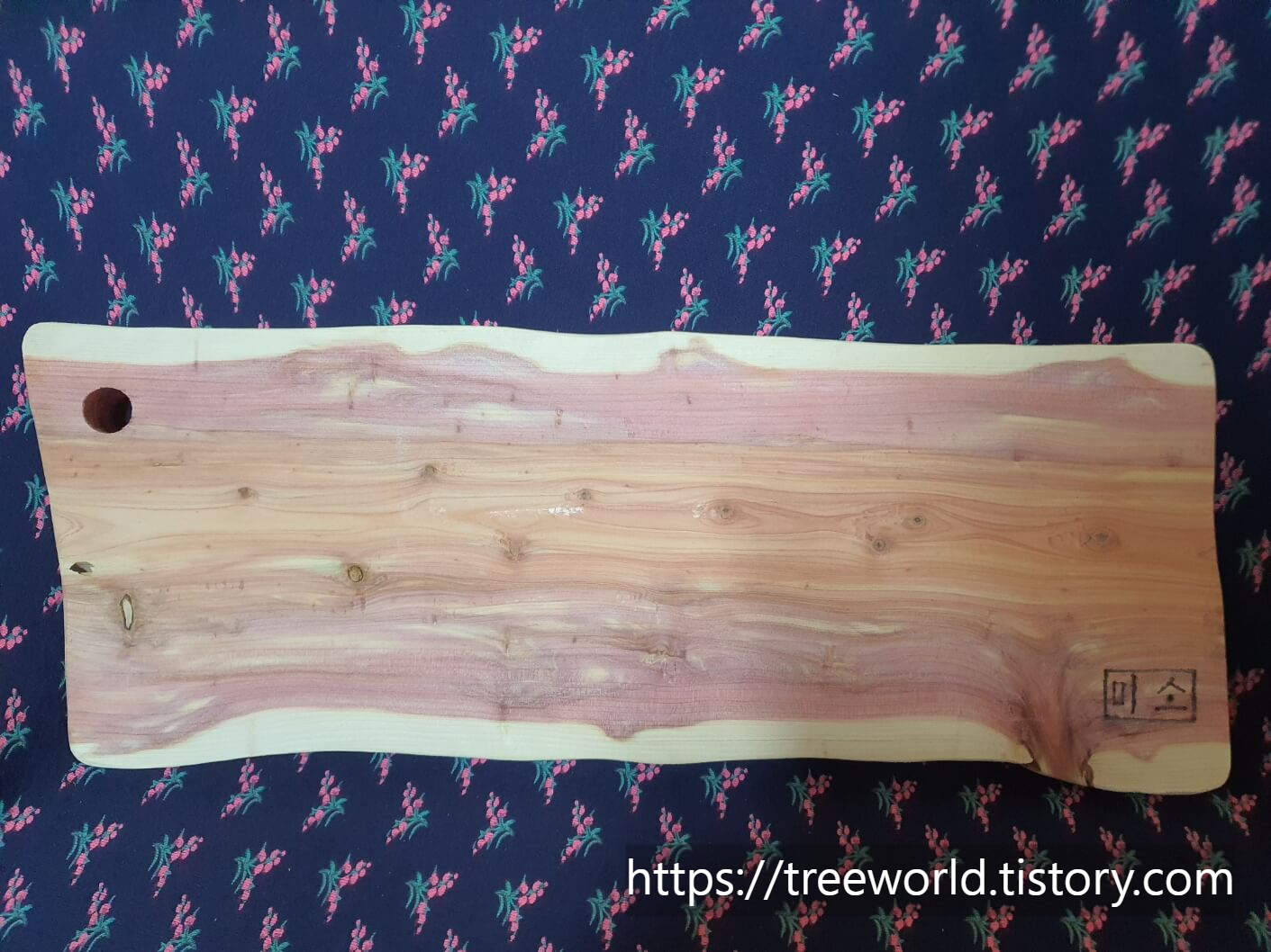 향나무 플레이트 원목 도마 만들기 마지막 공정은 연마가 완성된 도마에 구멍을 12~15mm 정도로 뚫고 목재용 인두로 이름 새기기를 하면 됩니다. 플레이트 도마는 음식을 올려놓고 먹는 용도이기 때문에 포도씨유등의 식물성 기름을 발라도 되지만 향나무 특유의 향을 위하여는 그냥 사용하는 것도 좋습니다. 물론 얼룩이 지거나 물로 씻을 때는 조심해야 합니다. 감사합니다.