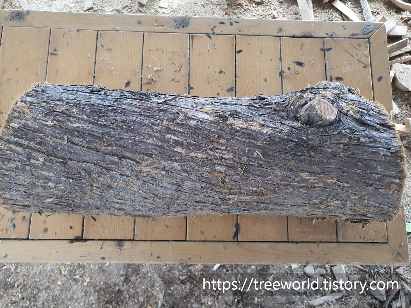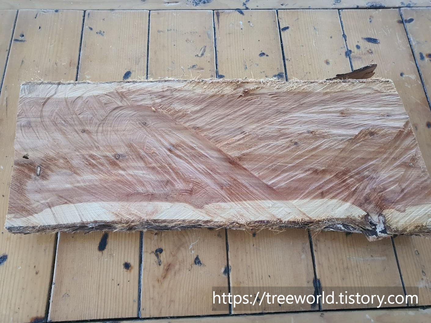 향나무 플레이트 도마를 만들기 위해서는 먼저 향나무를 건조시켜야 합니다. 원목상태에서는 최소 6개월 이상은 음지에서 건조를 시켜야 함수율이 20~30% 정도가 됩니다. 그런 다음 향나무를 엔진톱으로 잘라서 도마용 목재를 만듭니다.