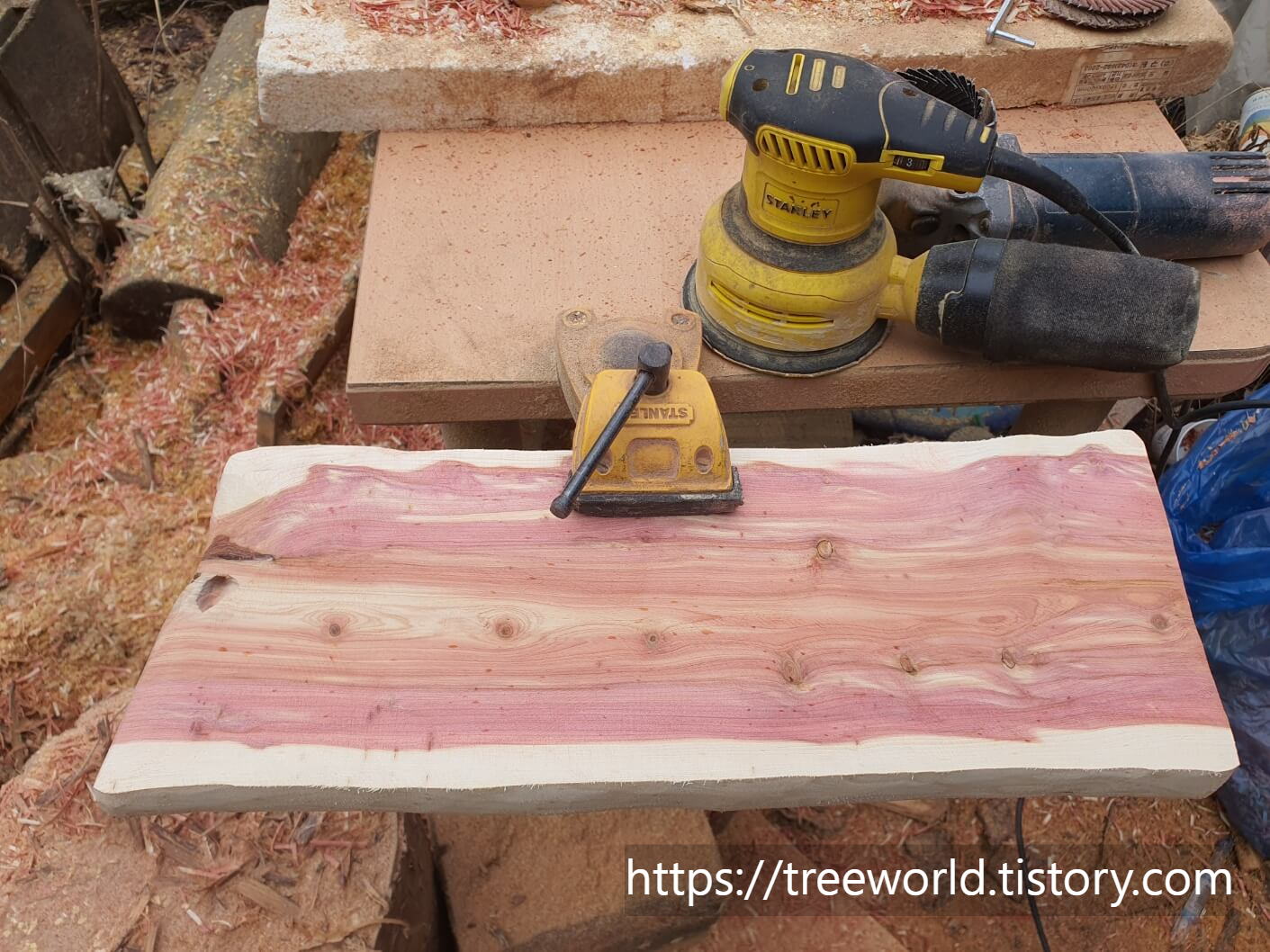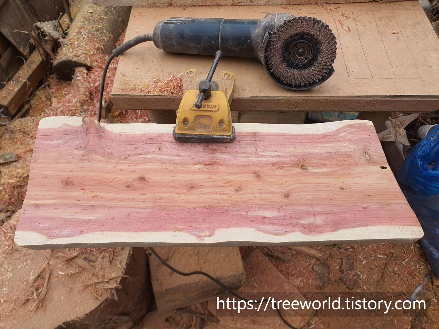 향나무 플레이트 원목 도마 만들기 공정은 순서가 있습니다. 거칠게 만들어진 목재를 바이스로 고정시키고 전동대패질을 하여 평평하게 만들어야 하는데 향나무는 무르기 때문에 대패의 날을 0.5mm 이하로 맞추고 원목을 깎아야 얇아지기 않고 평형하게 균형만 잡을 수 있습니다. 다음으로 고운 날의 그라인더로 모양 다듬기를 합니다. 향나무는 #120 이상의 목재용 그라인더 고운 날을 사용하여야 합니다. 특히 두 손으로 그라인더를 잡하야 안전 합니다. 마지막은 샌딩기의 날을 #200 이상으로 하여 연마작업을 하면 됩니다.