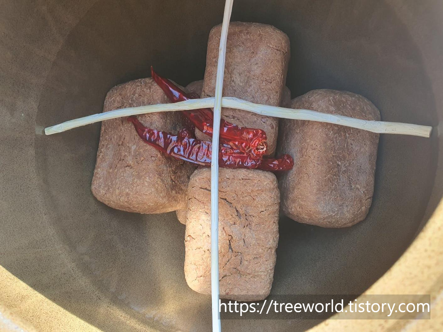 ① 메주는 흐르는물에 깨끗하게 빠르게 씻어 햇볕에 말린다. ② 항아리를 씻는다(세제 사용 금지) ③ 소금을 물에 넣고 잘 녹여 준비한다.(저울로 재서 농도를 맞춘다) ④ 항아리에 메주를 차곡차곡 담는다.(메주의 양이 항아리의 80%를 넘지 않게 한다) ⑤준비해 둔 소금물을 항아리에 붓는다. ⑥ 숯과 마른 고추 등을 넣고 뚜껑을 닫는다.
