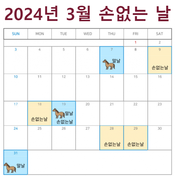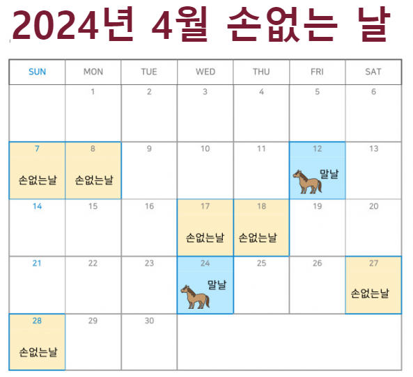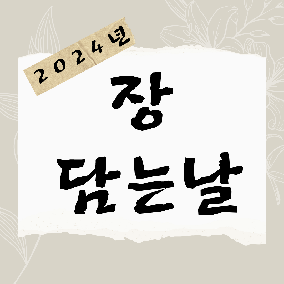 장 담는날은 손없는날과 "말날"입니다. 말날이라 함은 간지로 말 오자(午)가 들어간 날 즉 갑오 등과 같은 날을 말날이라고 합니다. 특히 말이 콩을 좋아해서 말의 기운이 왕성하고 천하의 기운이 일어나는 날이라는 의미입니다. 2024년의 손없는날과 말날은 다음과 같습니다. 이날이 2024년 장 담는날 입니다.