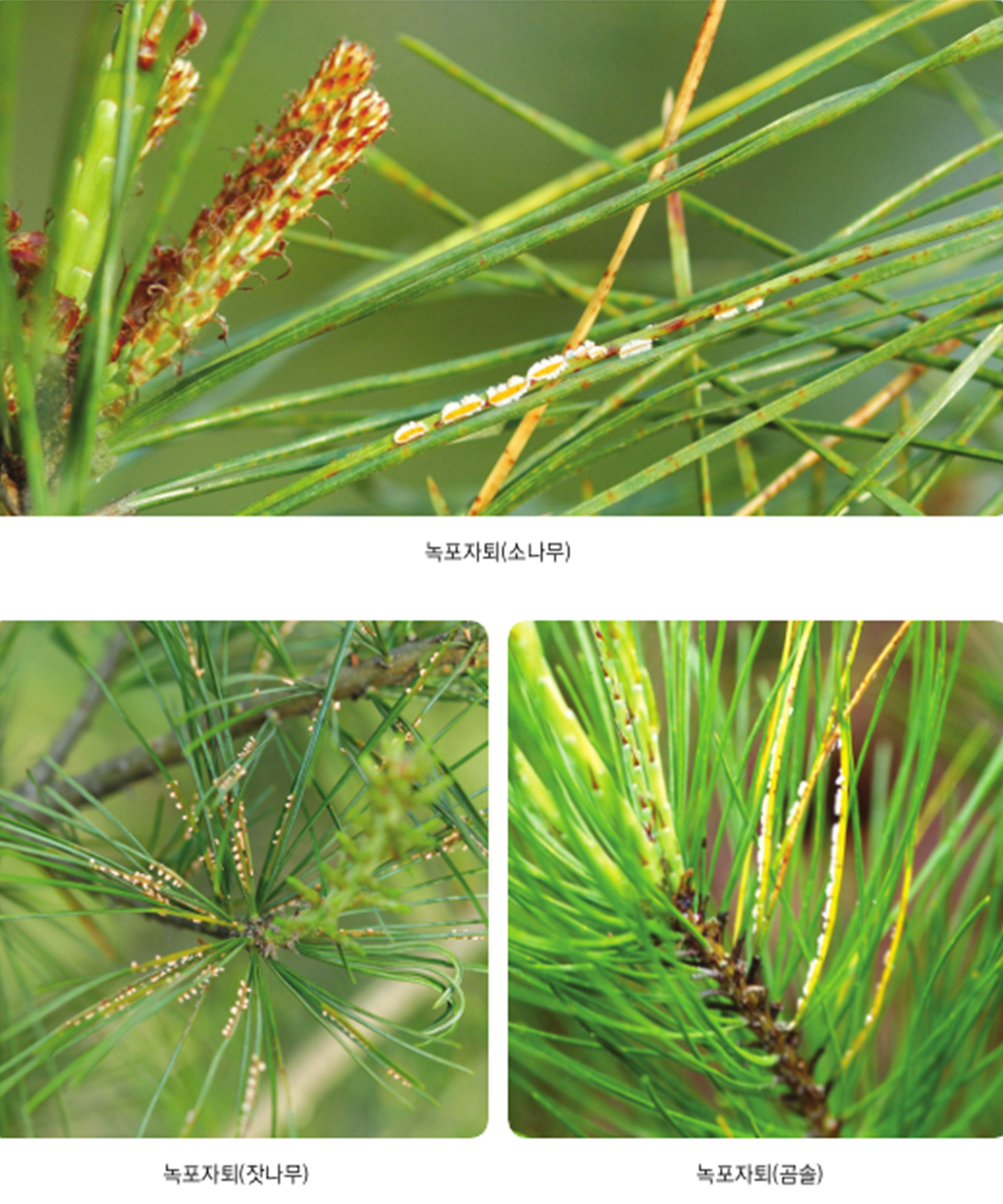 소나무류 잎녹병은 기주별 중간기주가 다릅니다. 곰솔잎녹병은 중간기주가 산초나무이고 소나무류 잎녹병은 황벽나무입니다. 여름, 가을 포자가 중간기주에서 겨울포자를 만들면 다시 기주로 가게되는데 월동은 담자포자로 하게 됩니다. 이러한 소나무류 잎녹병의 방제는 피해임지 5~10m이내에 풀 깎기를 하고 기주 주변의 중간기주를 제거하여야 합니다. 화학적 방제는 만코제브 수화제 600배액을 겨울포자가 발아하기 전인 9~10월에 3주 간격으로 1~3회 살포합니다.