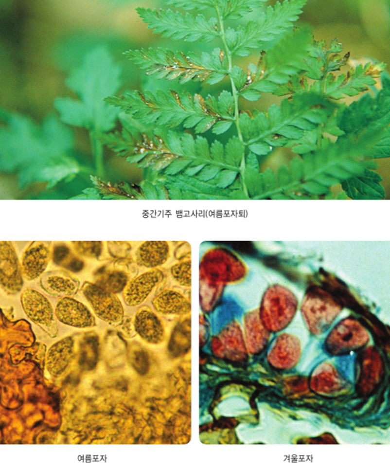 전마무 잎녹병의 중간기주는 뱀고사리입니다. 전나무 잎녹병의 여름포자는 뱀고사리에서 발생되며 겨울포자도 뱀고사리에서 월동을 합니다. 그러므로 전나무 잎녹병의 월동태인 겨울포자는 뱀고사리에서 월동을 하고 이듬해 기주이동을 하게 됩니다. 전나무 잎녹병의 방제는 전나무 임지부근의 중간기주인 뱀고사리를 제거하는 것입니다.