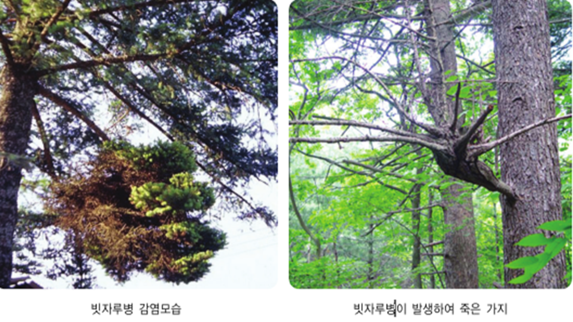 전나무 빗자루병의 중간기주는 점나도나물 입니다. 포자가 기주이동을 하여 중간기주인 점나도나물에서 여름포자를 만듭니다. 그리고 10월에 겨울포자가 만들어지면 다시 기주이동을 하여 전나무로 갑니다. 전나무 빗자루병으로 고사하는 경우는 거의 없기 때문에 특별한 방제 방법은 없습니다. 등록약제도 없습니다. 다만 빗자루모양으로 감염된 부위는 발생조기에 잘라서 소각하면 됩니다. 또 중간기주를 없애 전파 및 감염을 줄일 수 있습니다.