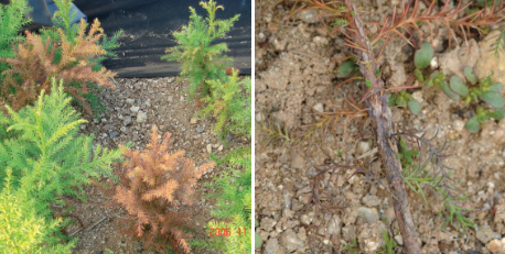 삼나무 붉은마름병의 병징이 나타난 지 7~10일 후에는 병반의 표면에 포자가 형성되며 9월 중순~10월 하순에 병환이 점차 확대되어 줄기전체에 나타나며 그 윗부분은 말라죽고 가지와 잎이 발갛게 마르는 현상이 발생됩니다. 병원균은 병든 잎에서 월동하며 이듬해 4~5월에 병든 잎에서 포자가 형성되어 전염원이 됩니다.