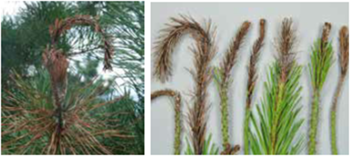 나무의사 2차시험 DVD병해 소나무류 가지끝마름병 피해는 주로 낮은 지대의 조림지와 골프장, 공원, 정원등에 조경용으로 심은 10~30년생의 나무에서 많이 발생합니다. 소나무류 가지끝마름병의 진단의 특징은 보통새순과 당년생 잎에만 나타나며 묵은 잎은 병에 잘 걸리지 않습니다. 또 말라죽은 새순과 어린 가지에서는 송진이 흘러나와 잎과 뒤엉키며 송진이 굳으면 가지는 쉽게 부러집니다. 나무의사 2차시험 DVD병해 소나무류 가지끝마름병은 수목병리학에 유사한 표징과 병징이 많아 명확한 구별법을 알아야 진단이 가능합니다.