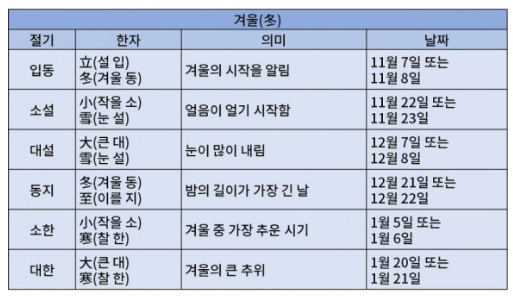 겨울의 절기는 입동, 소설, 대설, 동지, 소한, 대한의 6개의 절기가 있습니다. 24절기는 중국의 화북지방을 기준으로 한 것으로 소한이 대한보다 춥고 입춘은 한 달 정도 지나야 진정한 봄이 오는 거처럼 지금의 우리나라와는 정확히 일치하지 않습니다.