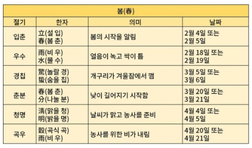 계절마다 6개의 절기가 있습니다. 봄의 절기는 입춘, 우수, 경칩, 춘분, 청명, 곡우가 있습니다.
