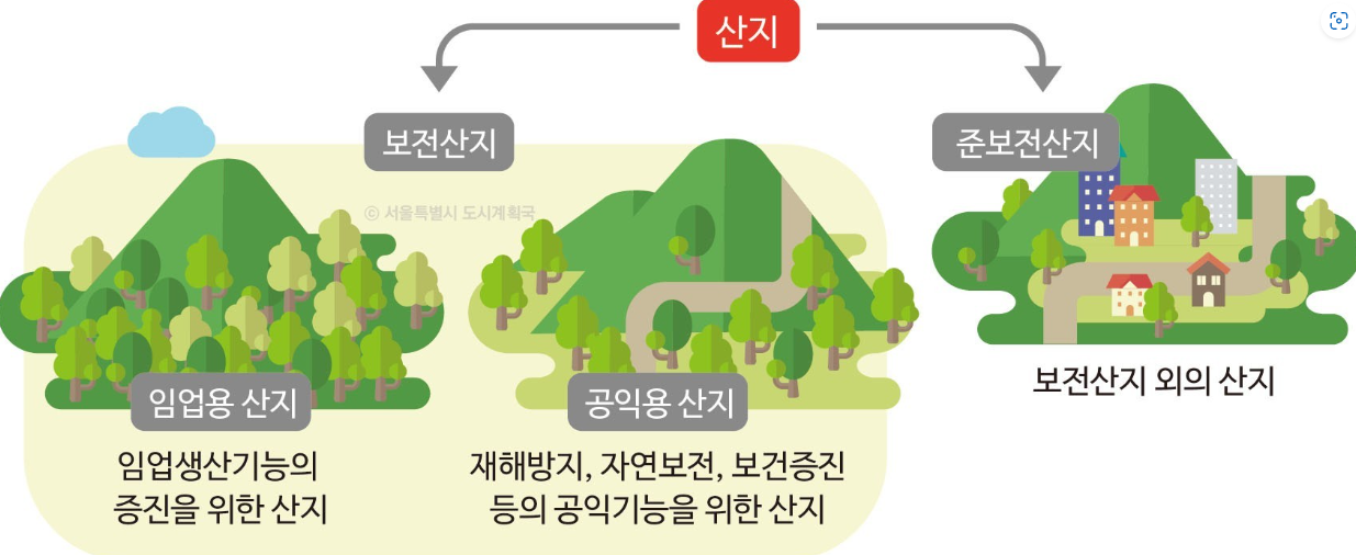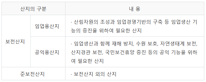 산지의 구분은 지목이 임야인 토지는 입목, 대나무의 집단 생육 등과 관련된 토지와 그 토지에 있는 암석지, 소택지, 임도나 작업로 등 산길을 말합니다. 산지는 합리적인 보전과 애용을 위하여 다음과 같이 세분하며, 이러한 구분에 따라 전국의 산지에 대하여 지형도면에 명시한 산지구분도 가 있니다.