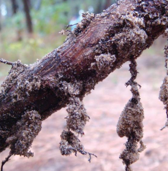 리지나뿌리썩음병의 진단은 감염지역 토양 위에 끝이 굴곡진 접시모양의 파상땅해파리버섯이 나타나게 됩니다. 버섯은 처음에는 옅은 노란색을 띠다가 갈색, 밤색을 띠며 성숙되면 밤색과 검은색을 띠게 됩니다. 산성토양에서 잘 발생되며 리지나뿌리썩음병의 균사는 불규칙한 동심원상에서 1년에 약 6~7m 정도 외곽으로 확산하며 균사 학산범위 내의 나무는 대부분 말라죽습니다. 리지나뿌리썩음병 병원균은 상대적으로 약해 불이 발생하여 토양 미생물들이 단순화된 상태에서 우점균을 발생됩니다. 특히 토양 미생물이 적은 해안가 모래의 소나무 숲에서 문제가 됩니다.